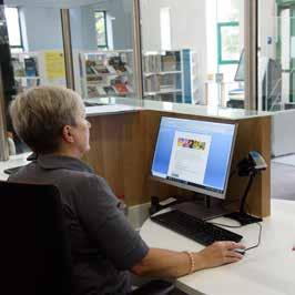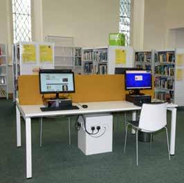 In the library I can see shelves of books and the self-service kiosks. I can also see the librarian’s desk and computers.