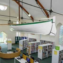 This is Buncrana Community Library. The library was once a Presbyterian Church. A boat called a Drontheim hangs from the high ceiling in the adult reading area.