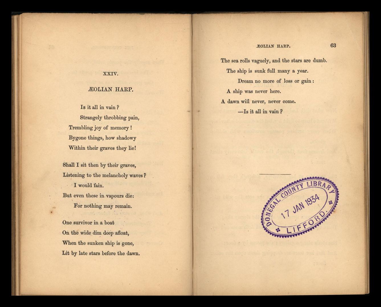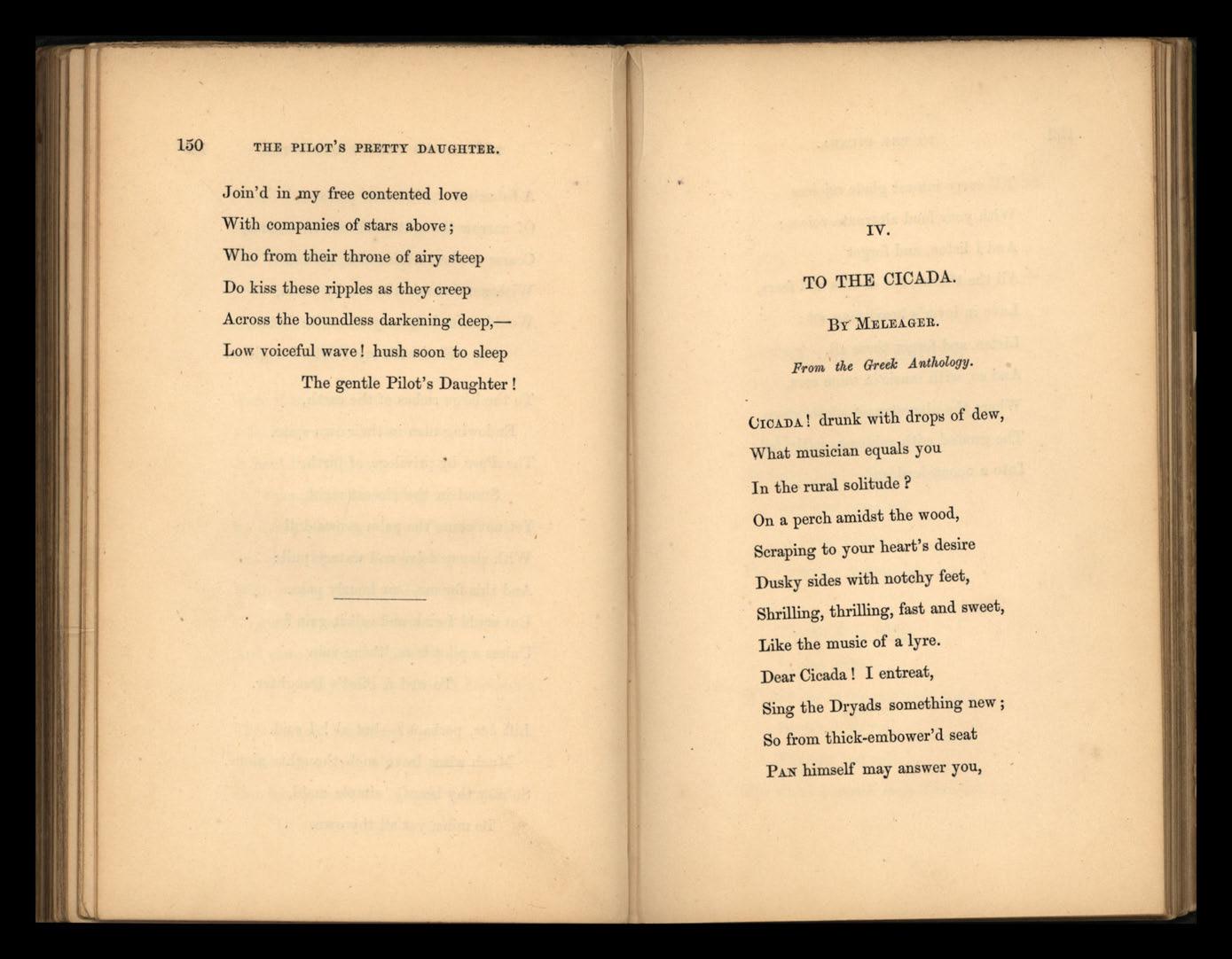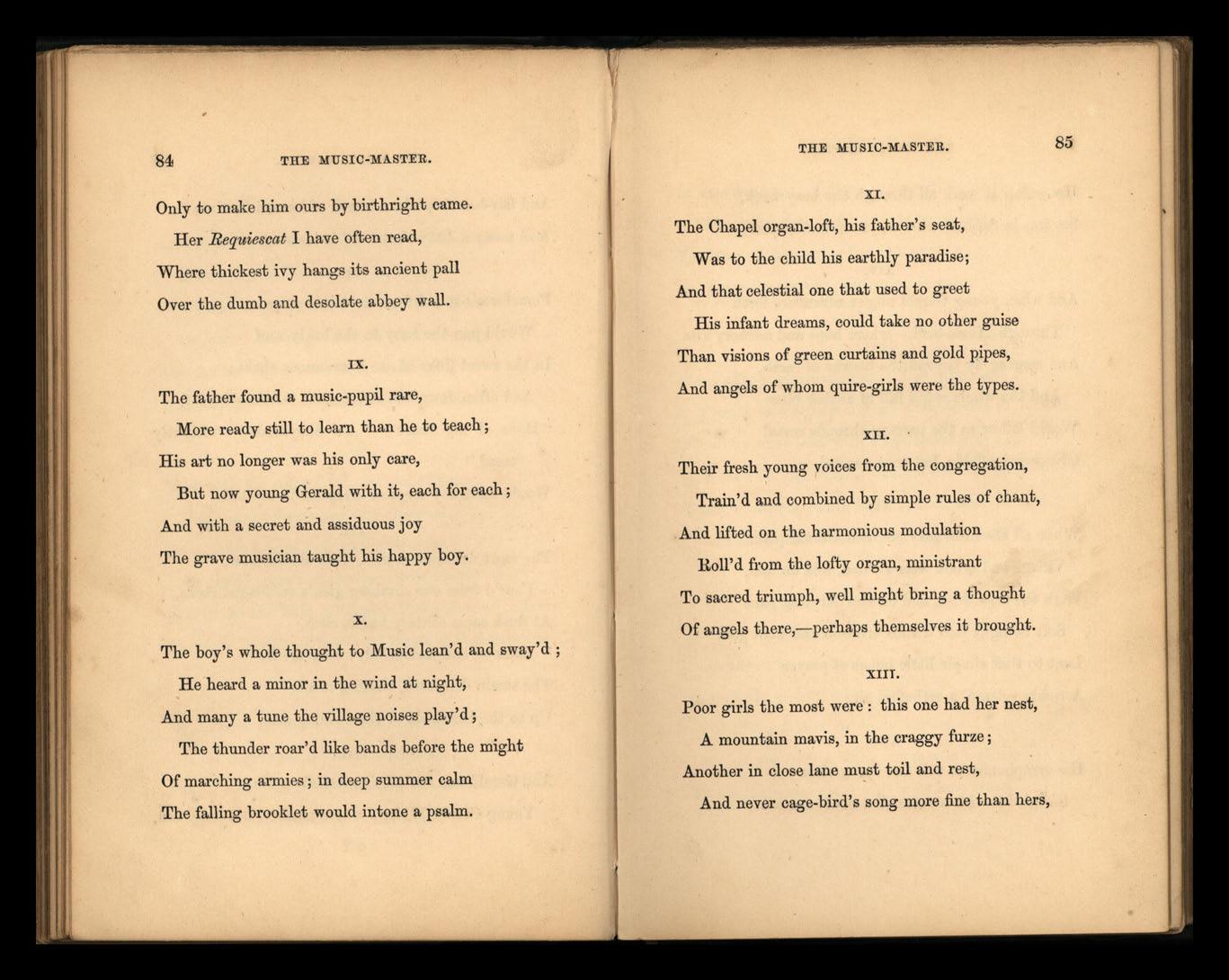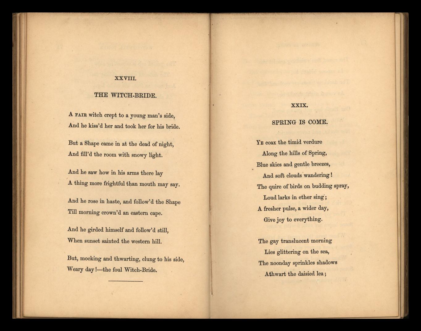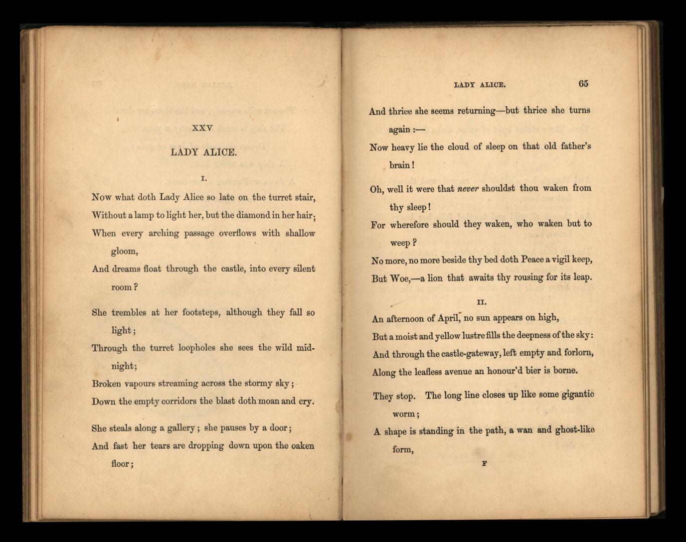 Half too changed to speak I thought her, Till the pictured silence broke, Sweet and clear as dropping water, Into words she sung or spoke.