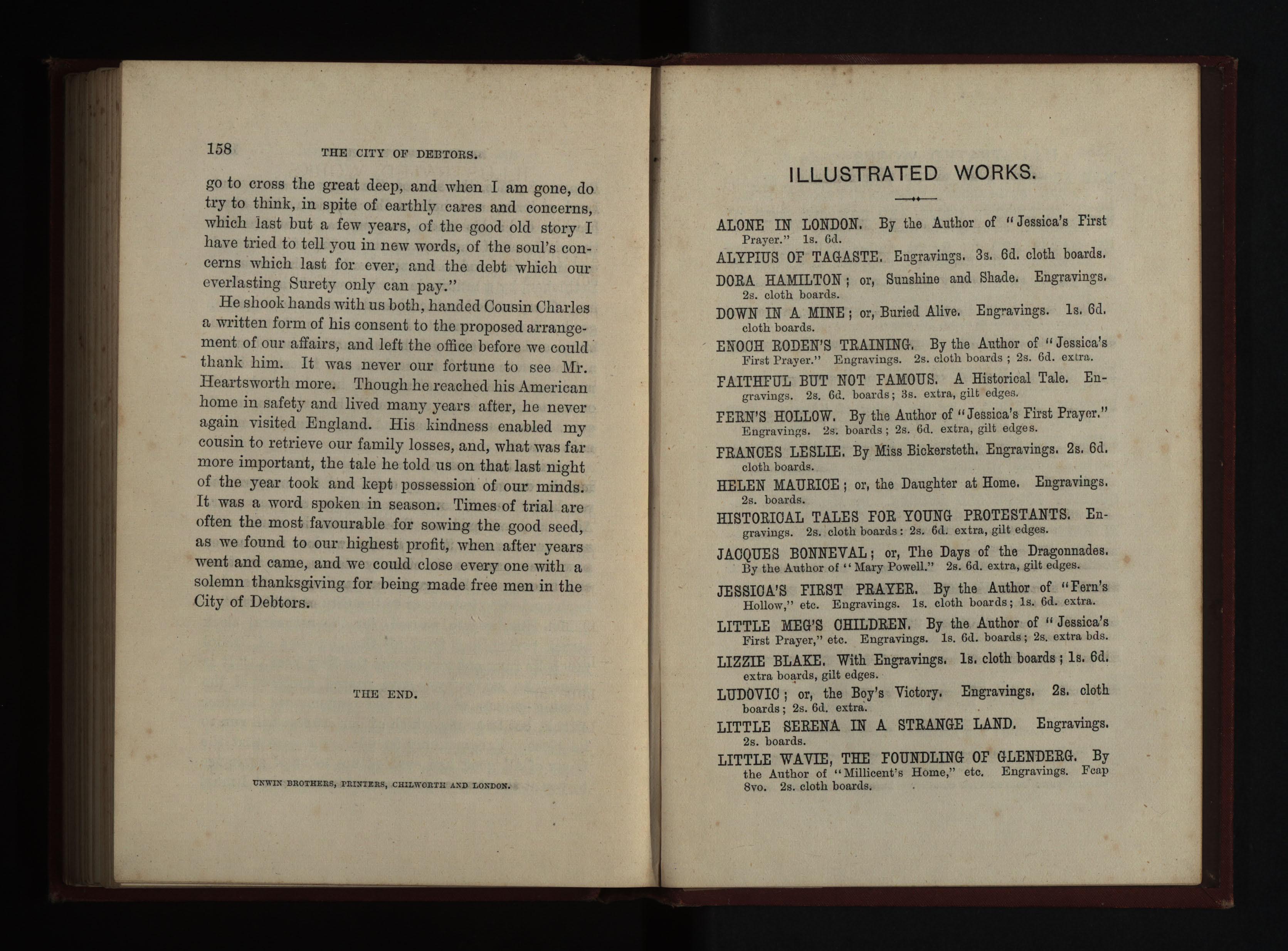 He shook hands with us both, handed Cousin Charles a Wl'itten form of his consent to the proposed arrangement of our affairs, and left the office beforo we could ' thank him. It was never our fortune to see Mr. Heartsworth more. Though he reached his American home in safety and lived many years after, he never again visited England. His kindness enabled my cousin to retrieve our family losses, and, what was far more important, the tale he told us on that last night of the year took and kept possession of our minds. It was a word spoken in season. Times of trial are often the most favourable for sowing the good seed, as we found to our highest profit, when after years went and came, and we could close everyone with a solemn thanksgiving for being made free men in the City of Debtors.