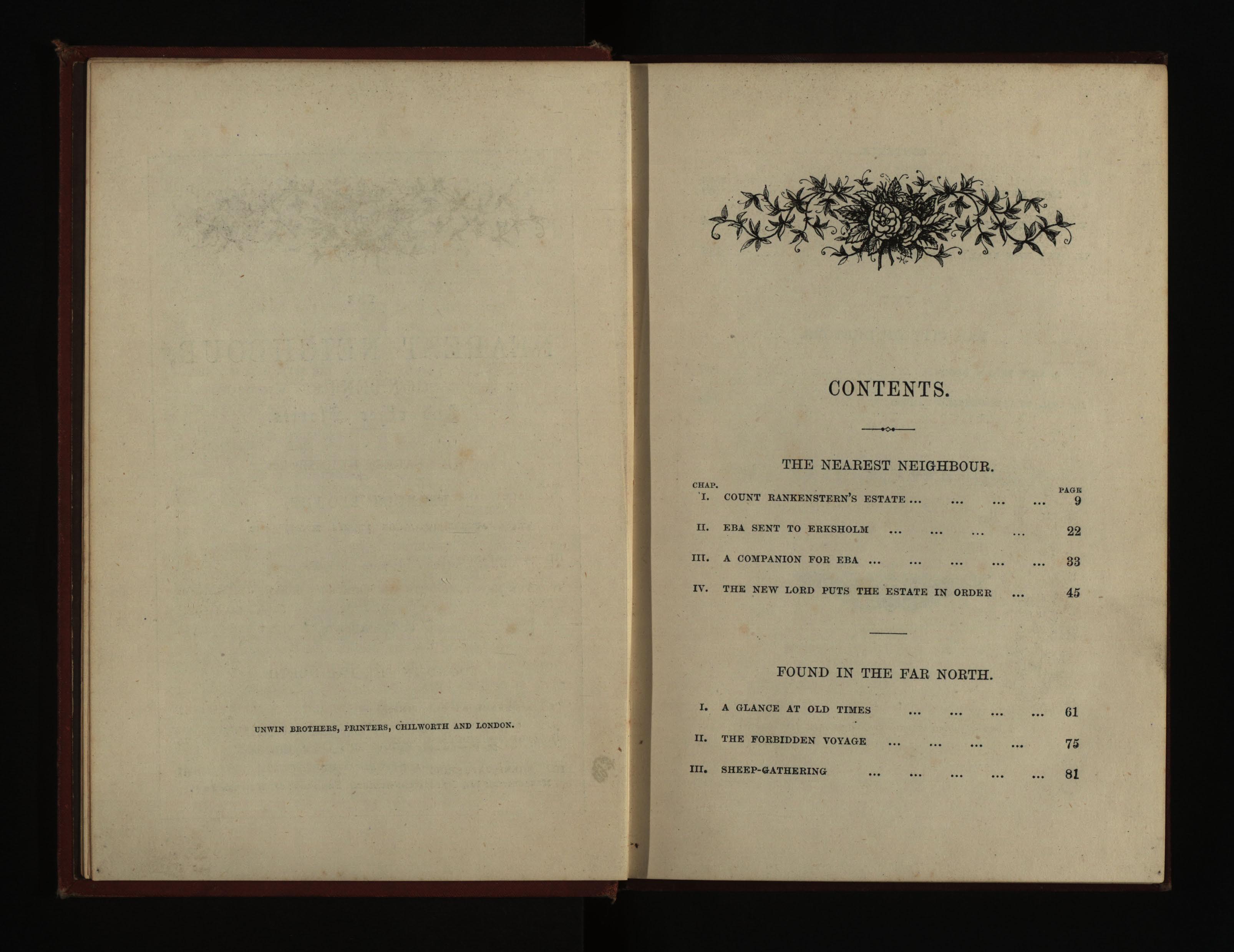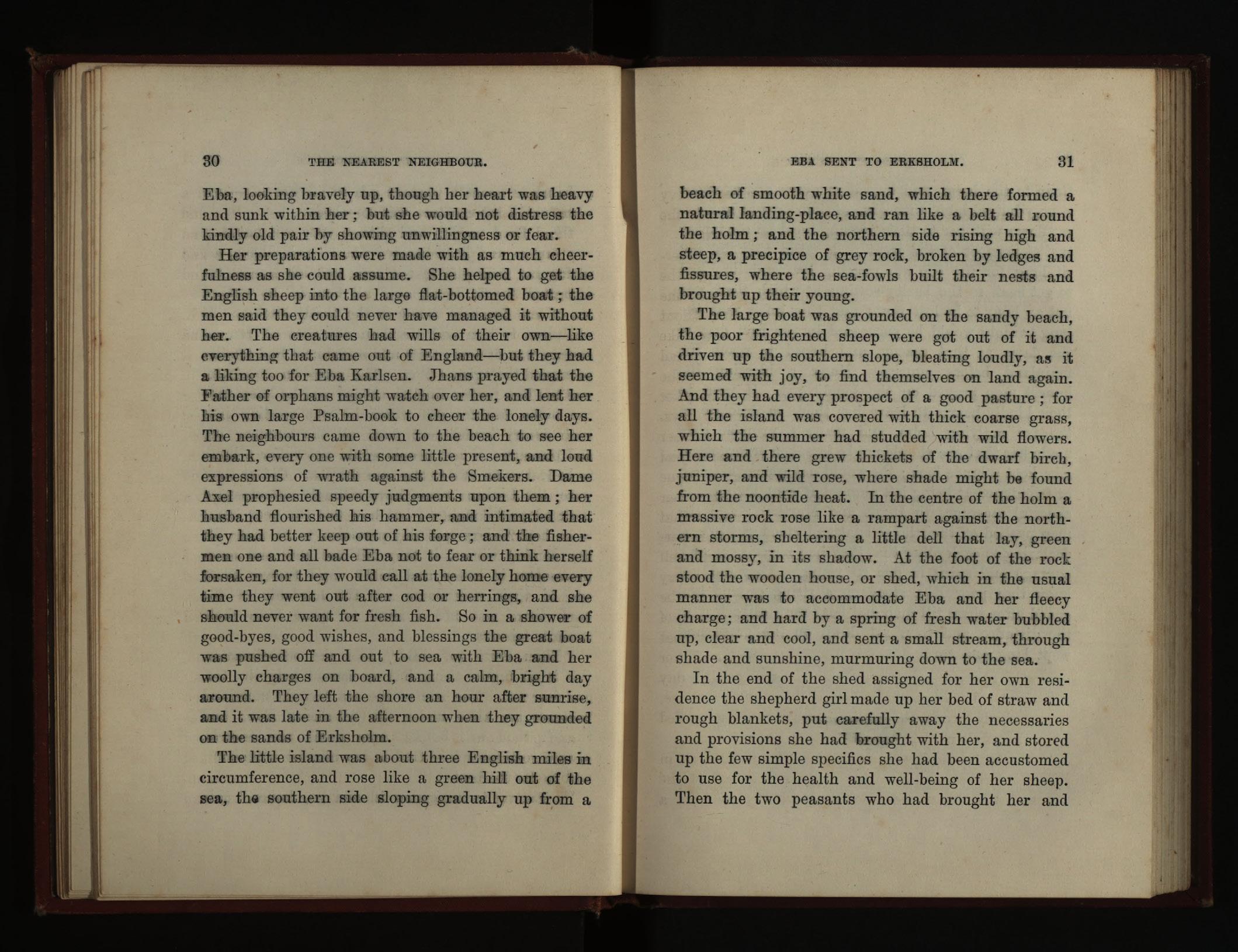 Eba, looking bravely up, though her heart was heavy and sunk within her; but she would not distress the kindly old pair by showing unwillingness or fear. Her preparations were made with as much cheerfulness as she could assume. She helped to get the English sheep into the large flat-bottomed boat; the men said they could never ha,e managed it without her. The creatures had wills of their own-like everything that came out of England-but they had a liking too for Eba Karlsen. Jhans prayed that the Fltther of orphans might watch over her, and lent her his own large Psalm-book to cheer the lonely days. The neighbours came down to the beach to see her emb8.l'k, every one with some little present, and loud expressions of WTath against the Smekers. Dame Axel prophesied speedy judgments upon them; her husband flourished his hammer, and intimated that they had better keep out of his forge; and the fishermen one and all bade Eba not to fear or think herself forsaken, for they would call at the lonely home every time they went out after cod or herrings, and she should never want for fresh fish. So in a shower of good-byes, good wishes, and blessings the great boat was pushed off and out to sea with Eba and her woolly charges on board, and a calm, bright day around. They left the shore an hour after sunrise, and it was late in the afternoon when they grounded on the sands of Erksholm.