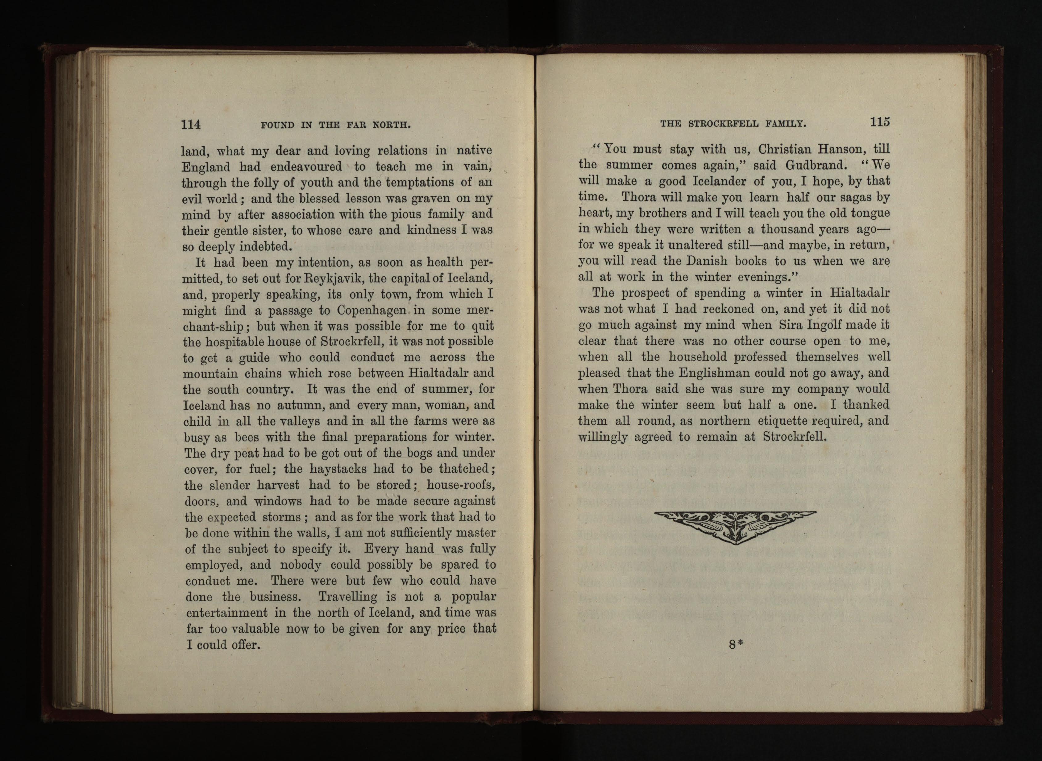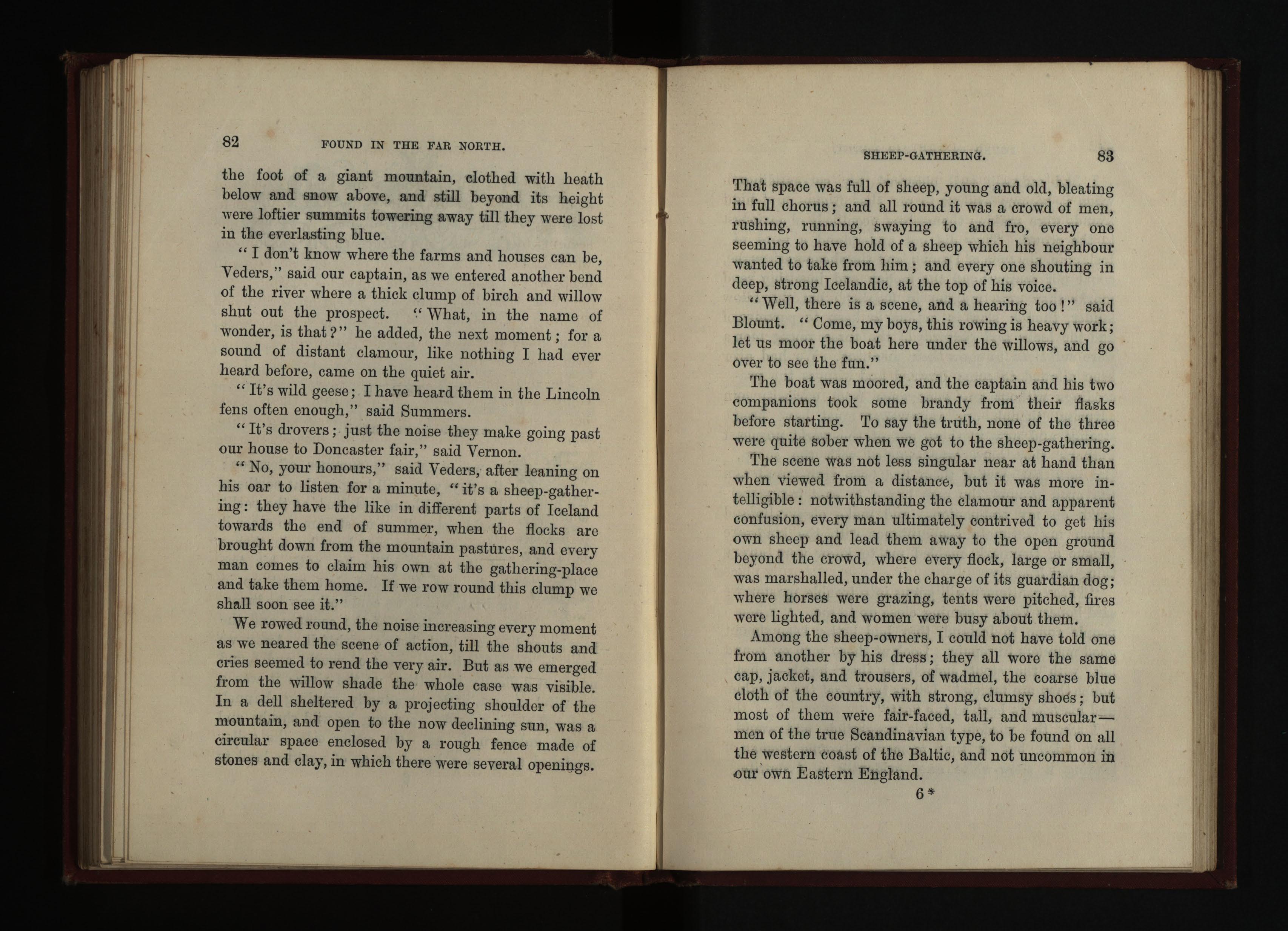 The large boat was grounded on the sandy beach, the poor frightened sheep were got out of it and driven up the southern slope, bleating loudly, all it seemed with joy, to find themselves on land again. And they had every prospect of a good pasture; for all the island was covered with thick coarse grass, which the summer had studded with wild flowers. Here and there grew thickets of the dwarf birch, juniper, and wild rose, where shade might be found from the noontide heat. In the centre of the holm a massive rock rose like a rampart against the northern storms, sheltering a little dell that lay, green and mossy, in its shadow. At the foot of the rock stood the wooden house, or shed, which in the usual manner was to accommodate Eba and her fleecy charge; and hard by a spring of fresh water bubbled up, clear and cool, and sent a small stream, through shade and sunshine, murmuring down to the sea.