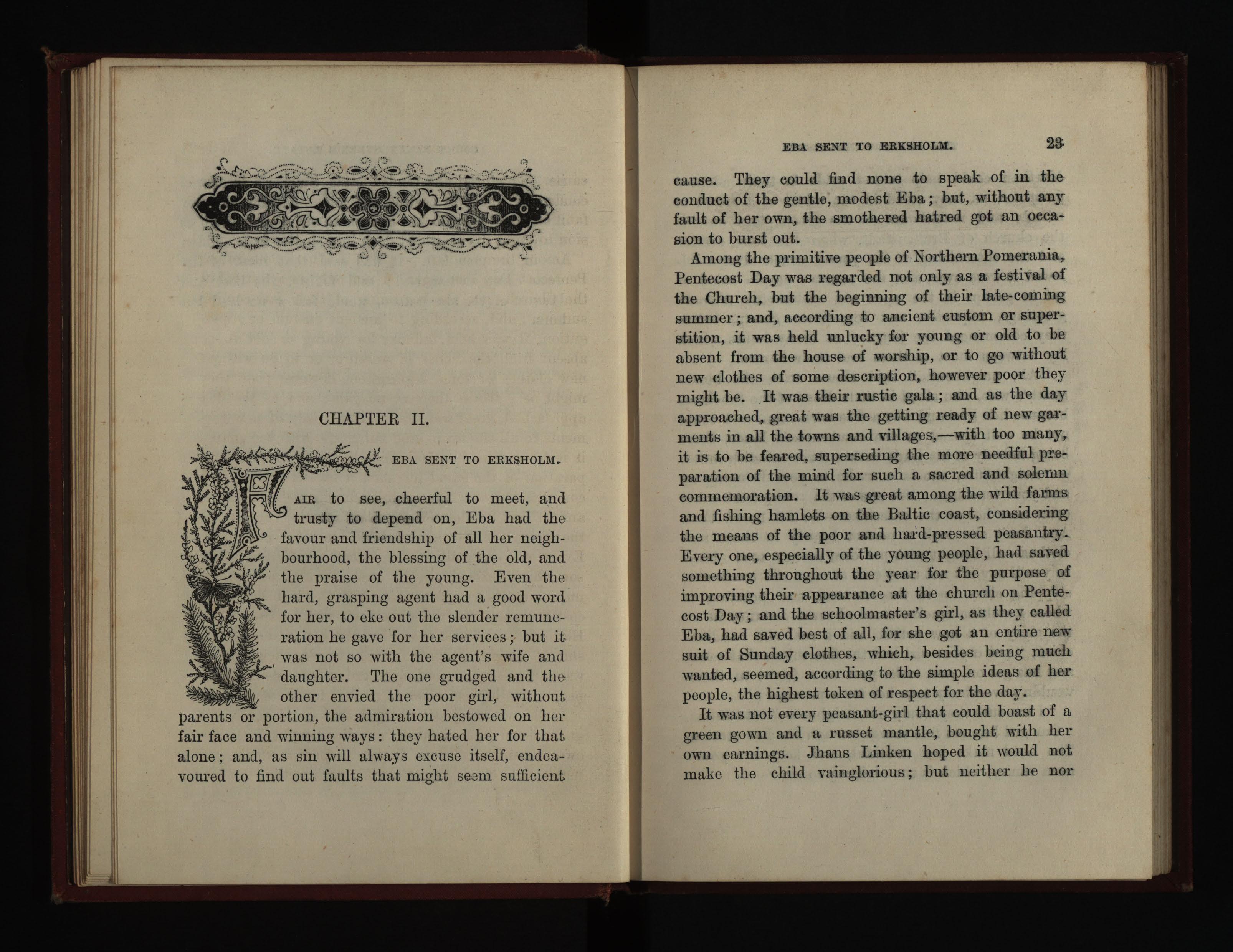 Among the primitive people of NorthernPomerania. Pentecost Day was regarded not only as a festival of the Church, but the beginning of their late-coming summer; and, according to ancient custom or superstition, it was held unlucky for young or old to be absent from the house of worship, or to go without new clothes of some description, however poor they might be. It was their rustic gala; and as the day :\pproached, gTeat was the getting ready of new garments in all the towns and villages,-with too many, it is to be feared, superseding the more needful preparation of the mind for such a sacred and solemn commemoration. It was great among the wild farms and fishing hamlets on the Baltic coast, considering the means of the poor and hard-pressed peasantry. Everyone, especially of the young people, had saved something throughout the year for the purpose of improving their appearance at the church on Pentecost Day; and the schoolmaster's girl, as they called Eba, had saved best of all, for she got an entire new suit of Sunday clothes, which, besides being much wanted, seemed, according to the simple ideas 01 her people, the highest token of respect for the day.
