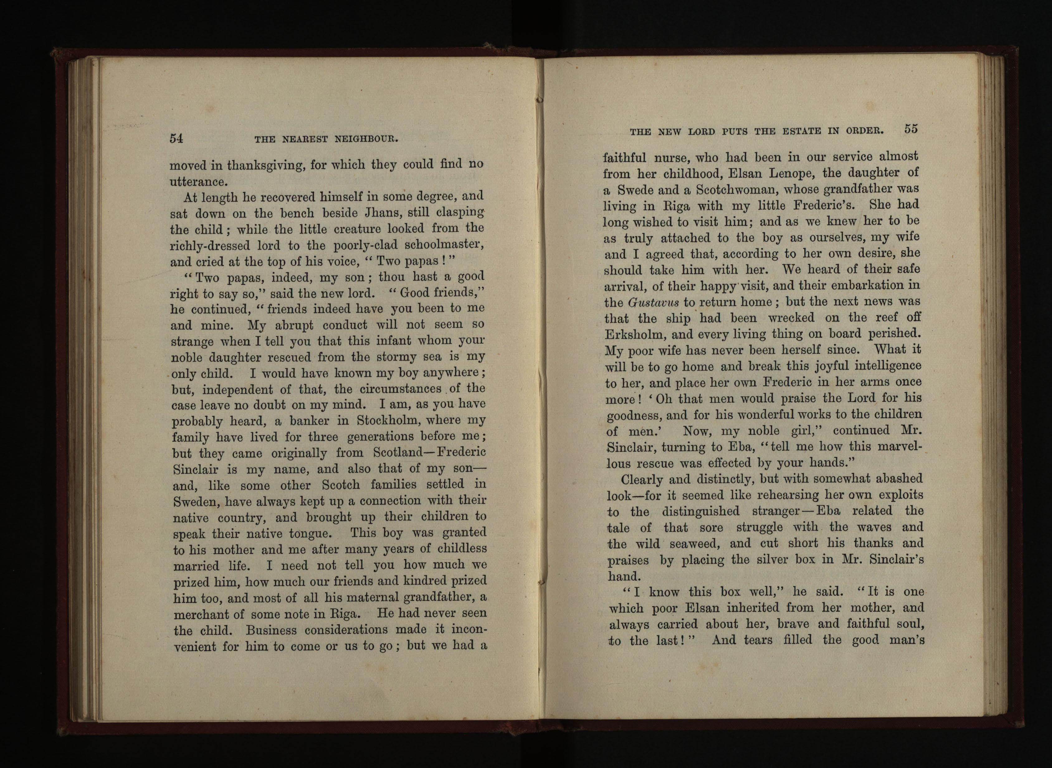 Eba had accomplishments of her own which stood her in better stead than theirs would have done. The honest schoolmaster was not a little proud of her abilities in reading the few books which he possessed, singing the old psalm-tunes, and repeating the Lutheran catechism; and her skill and care in the business of sheep-keeping gained the entire a pprobation of Mats Smeker.