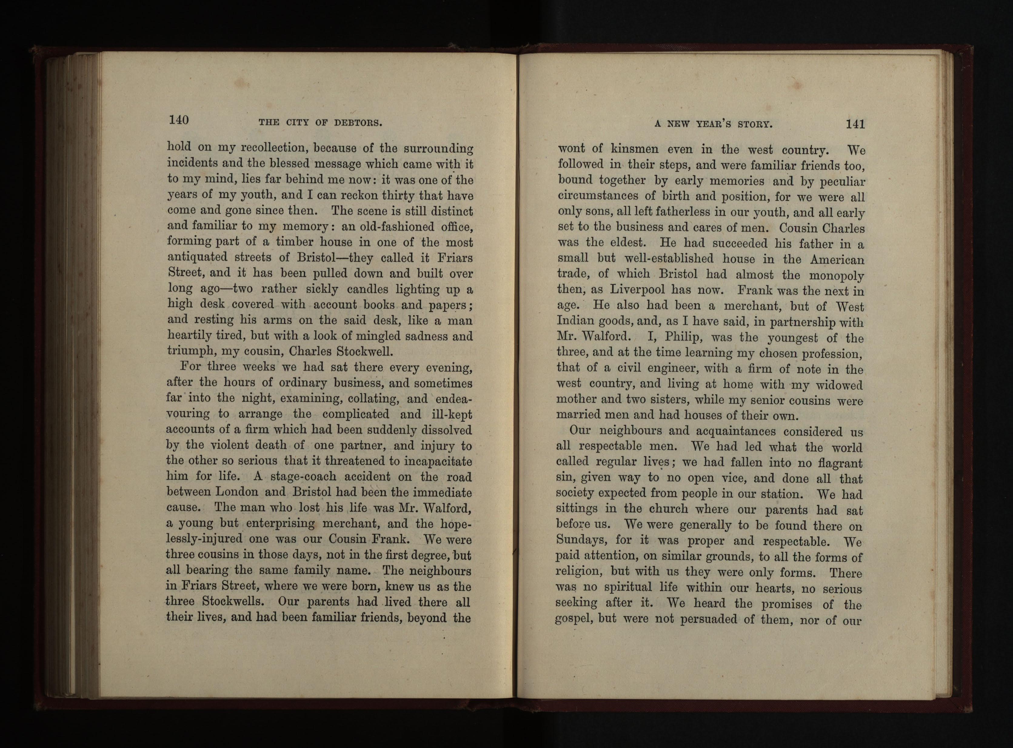 For three weeks we had sat there every evening, after the hours of ordinary business, and sometimes far into the night, examining, collating, and endeavouring to arrange the complicated and ill-kept accounts of a firm which had been suddenly dissolved by the violent death of one partner, and injury to the other so serious that it threatened to incapacitate him for life. A stage-coach accident on the road between London and Bristol had been the immediate cause. The man who lost his life was Mr. Walford, a young but enterprising merchant, and the hopelessly-injured one was our Cousin Frank. We were three cousins in those days, not in the first degree, -but all bearing the same family name. The neighbours in Friars Street, where we were born, knew us as the three Stockwells. Our parents had lived there all their lives, and had been familiar friends, beyond the