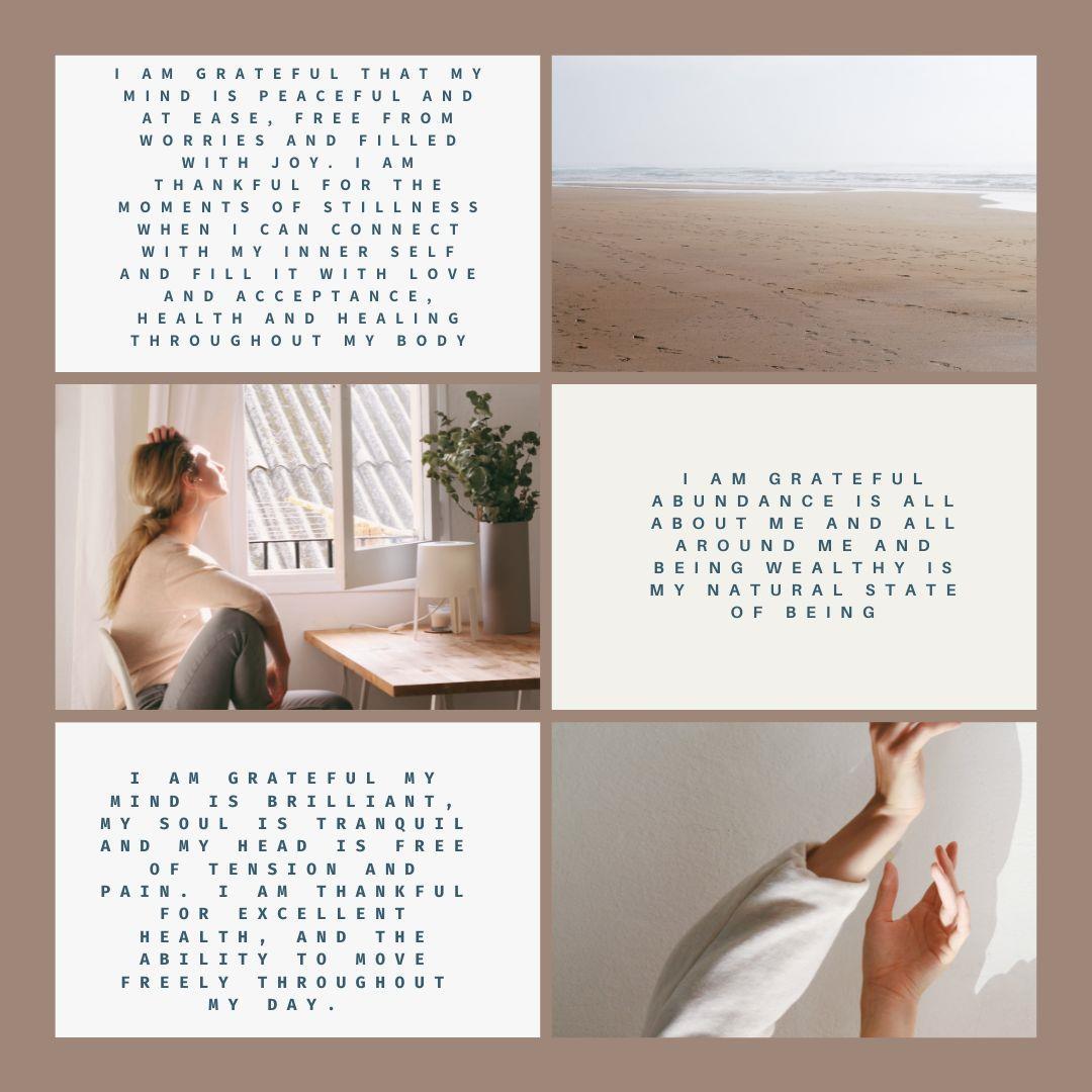 • I am grateful that my mind is peaceful and at ease, free from worries and filled with joy. I am thankful for the moments of stillness when I can connect with my inner self and fill it with love and acceptance, health and healing throughout my body.