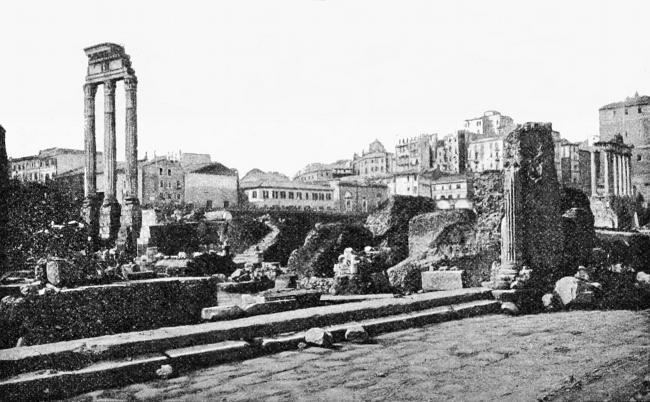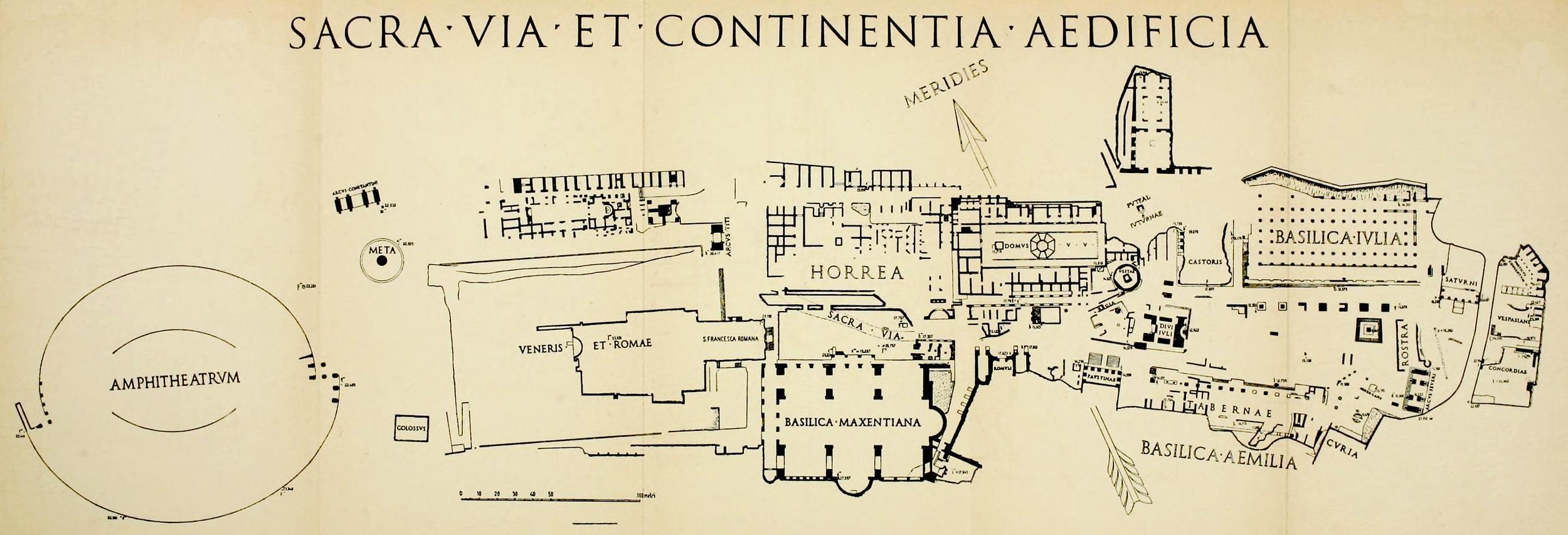 L'attività dell'architetto Boni e de' suoi bravi operai si rivolse inoltre al luogo del rogo di Cesare, ai rostra, dove si scopersero quattro gradini di fondamenta delle vestigia curvilinee che già conosciamo e alla Basilica Iulia (ved. tav. 93).