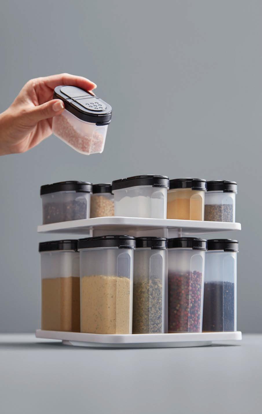 rotating, two-tier rack creates extra pantry space while keeping spices in easy reach.