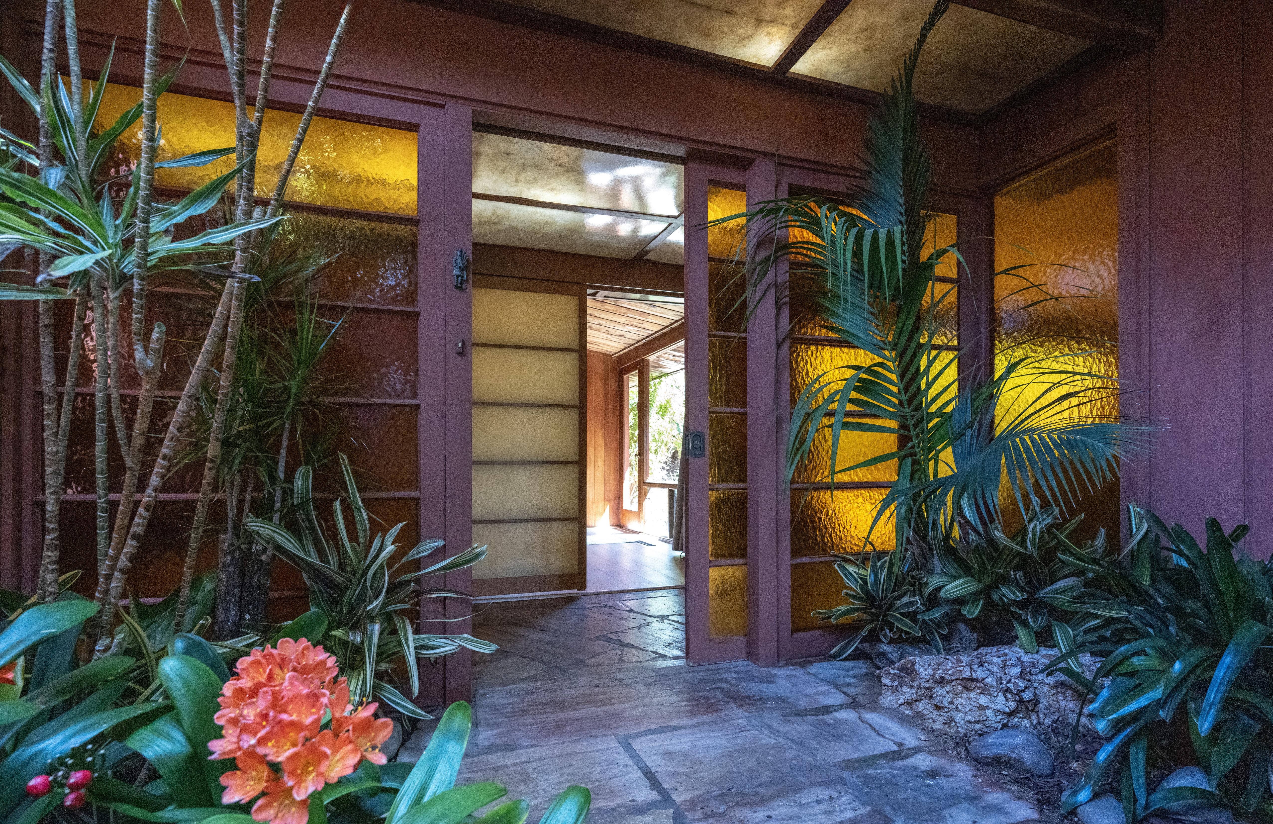 • The open-concept living area with views of the lush and exotic mature landscape.