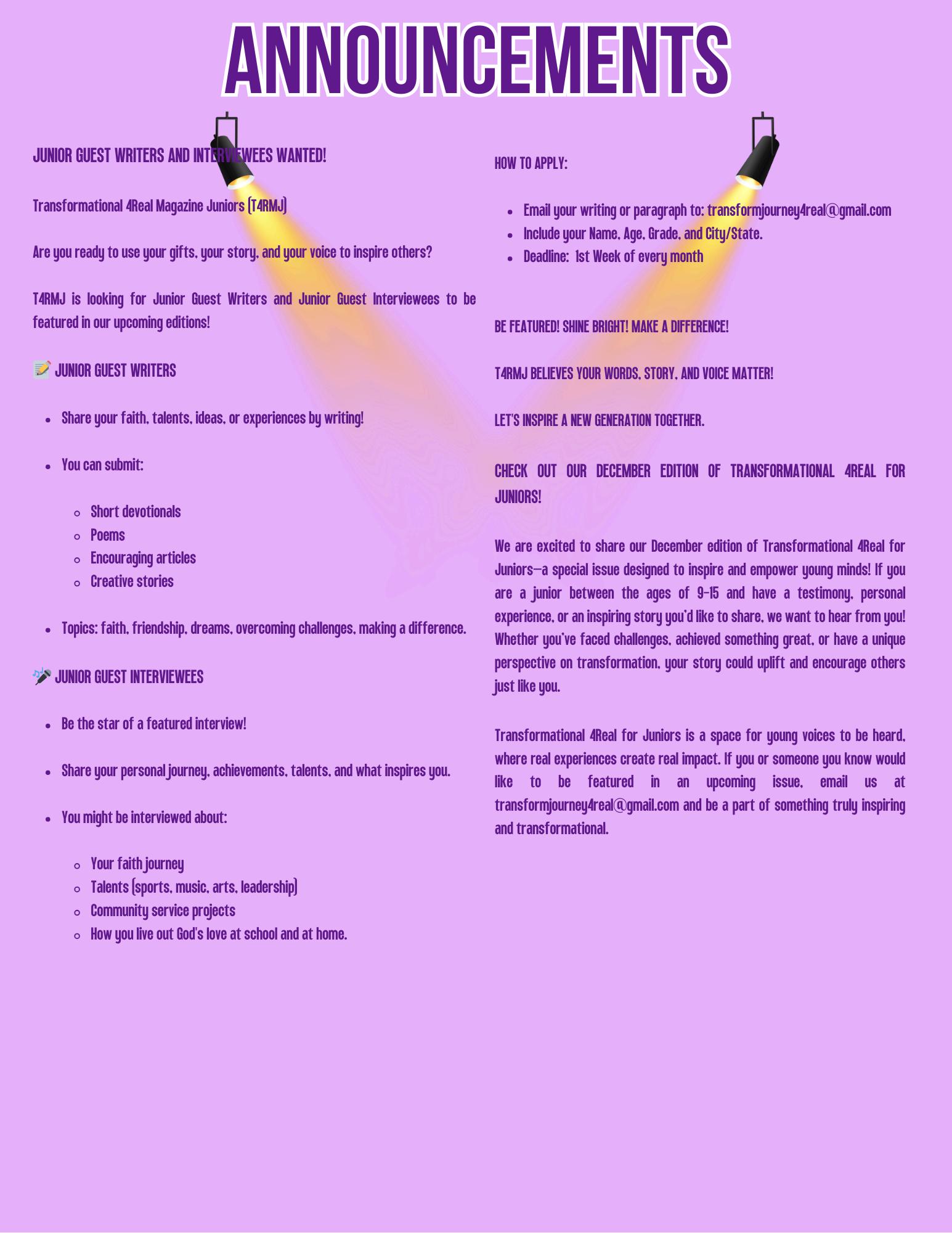 Transformational 4Real Magazine for Juniors is committed to inspiring, educating, and empowering children, ages 9 to 15 to grow in wisdom, character, and faith. Grounded in biblical principles, our mission is to nurture young minds with content that encourages confidence, creativity, leadership, and a heart for service. Through uplifting stories, engaging activities, and faith-based teachings, we aim to instill values of kindness, perseverance, and integrity. With God at the center of transformation, we encourage children to embrace their unique gifts, walk in purpose, and make a real difference in their communities and the world."
