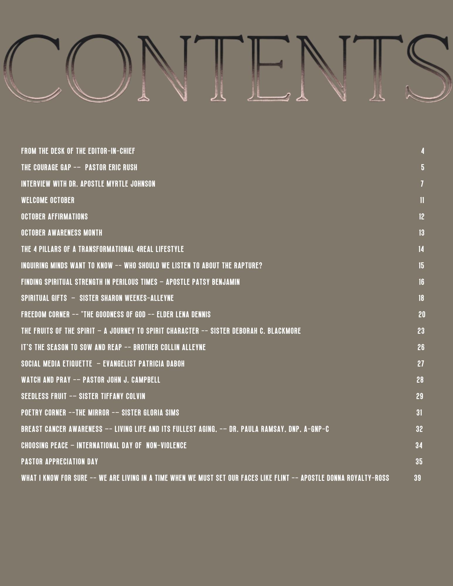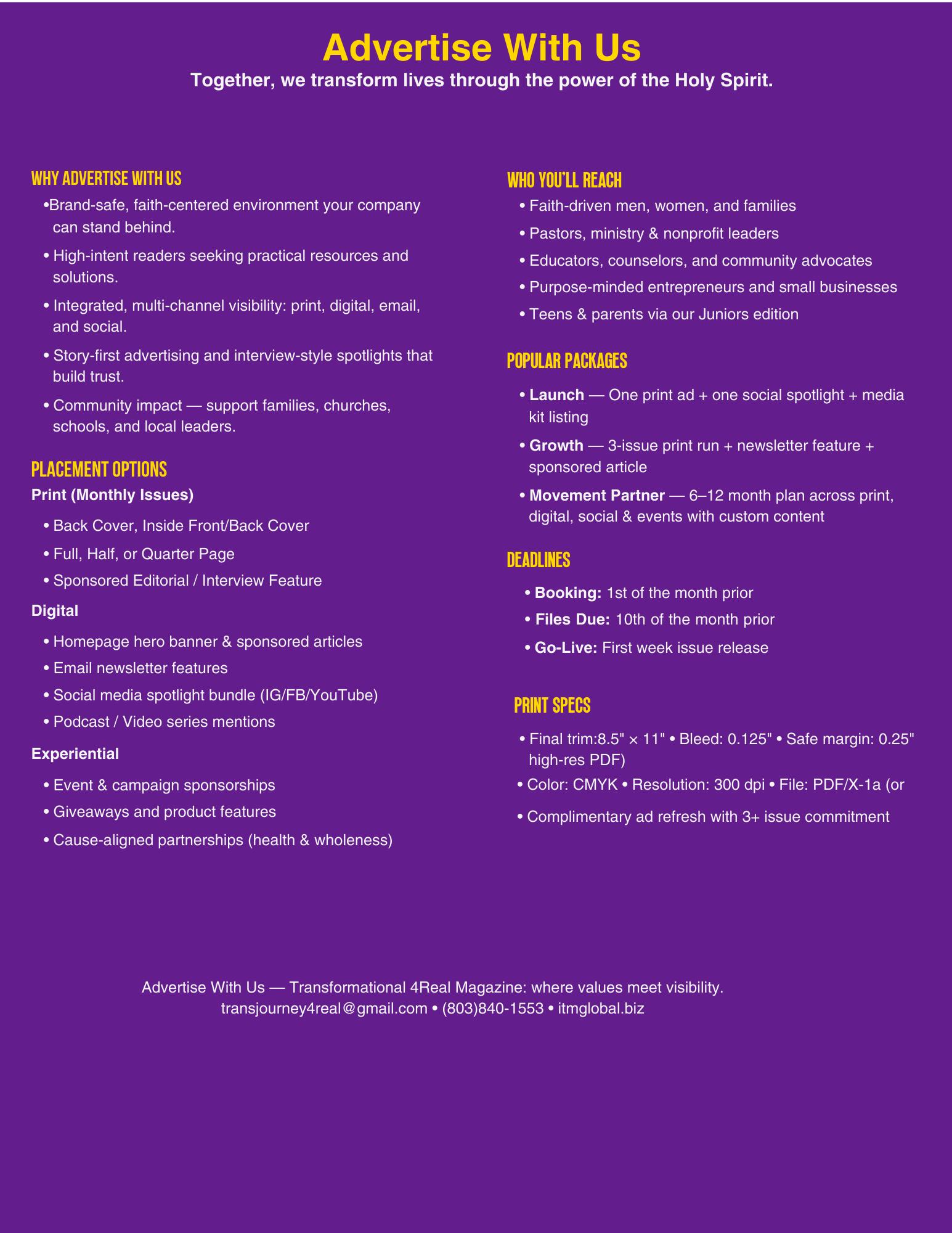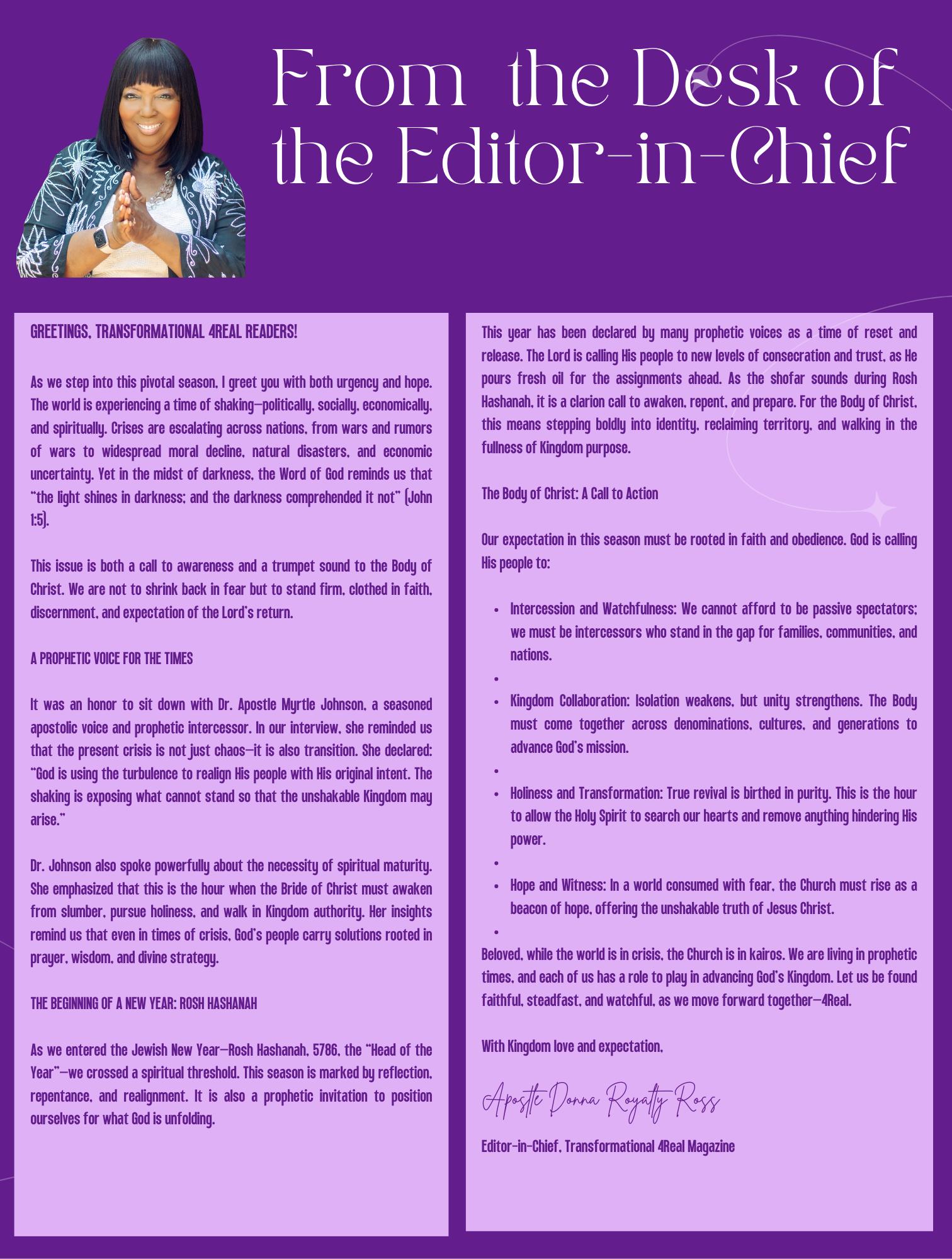 This month’s edition of Transformational 4Real Magazine is filled with powerful insights and life-changing encouragement to help you walk boldly in your faith. In honor of Clergy Appreciation Month, we highlight voices who lead, shepherd, and inspire with the heart of Christ. You’ll also find articles that address spiritual growth, and Kingdom living in today’s world. From real-life issues to practical tools for living with purpose, this October issue is designed to remind you that transformation is possible — 4Real.