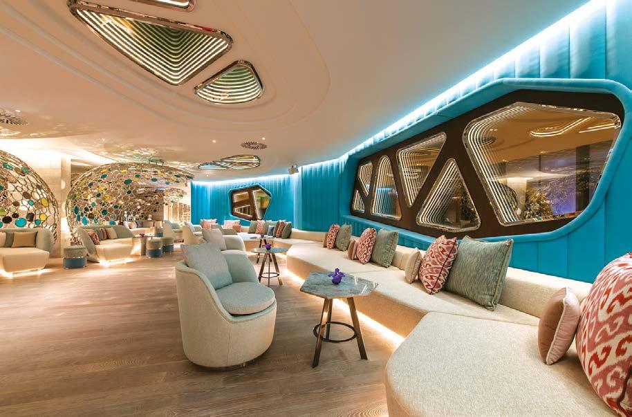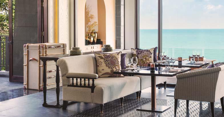 the design. Reminiscent of a Mughal courtyard, the lobby lounge makes quite a statement. The 10m high ceiling and walls are adorned by original Mughal- and Indian-inspired artworks alongside Ottoman-influenced tapestries.