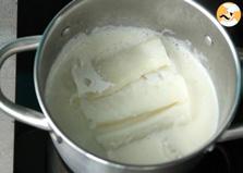 1. Hervir la leche. Cuando empiece a hacer burbujas, añadir los filetes de bacalao y cocinar durante 10 min a fuego medio.