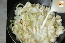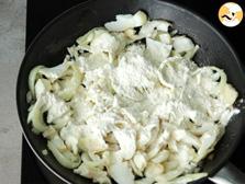 3. En una sartén, pochar la cebolla cortada en juliana en aceite de oliva. Cuando se vuelvan transparentes, añadir los trozos de bacalao + harina y mezclar.