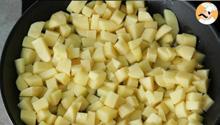 5. Pelar y cortar las patatas en dados. Cocinarlas en aceite caliente. No queremos freírlas completamente, sólo medio cocinarlas hasta que estén casi blandas.