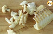 2. Después de la cocción, escurrirlos y reservar la leche restante que nos servirá más tarde. Desmigar los filetes quitando las raspas.