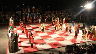 que dan vida a diversos personajes. Tomando como base una partida de ajedrez, cada año se narra una historia diferente que cuenta con un argumento, escenografía y acompañamiento musical. No es preciso conocer las reglas de este juego para disfrutar y entender esta recreación teatral.