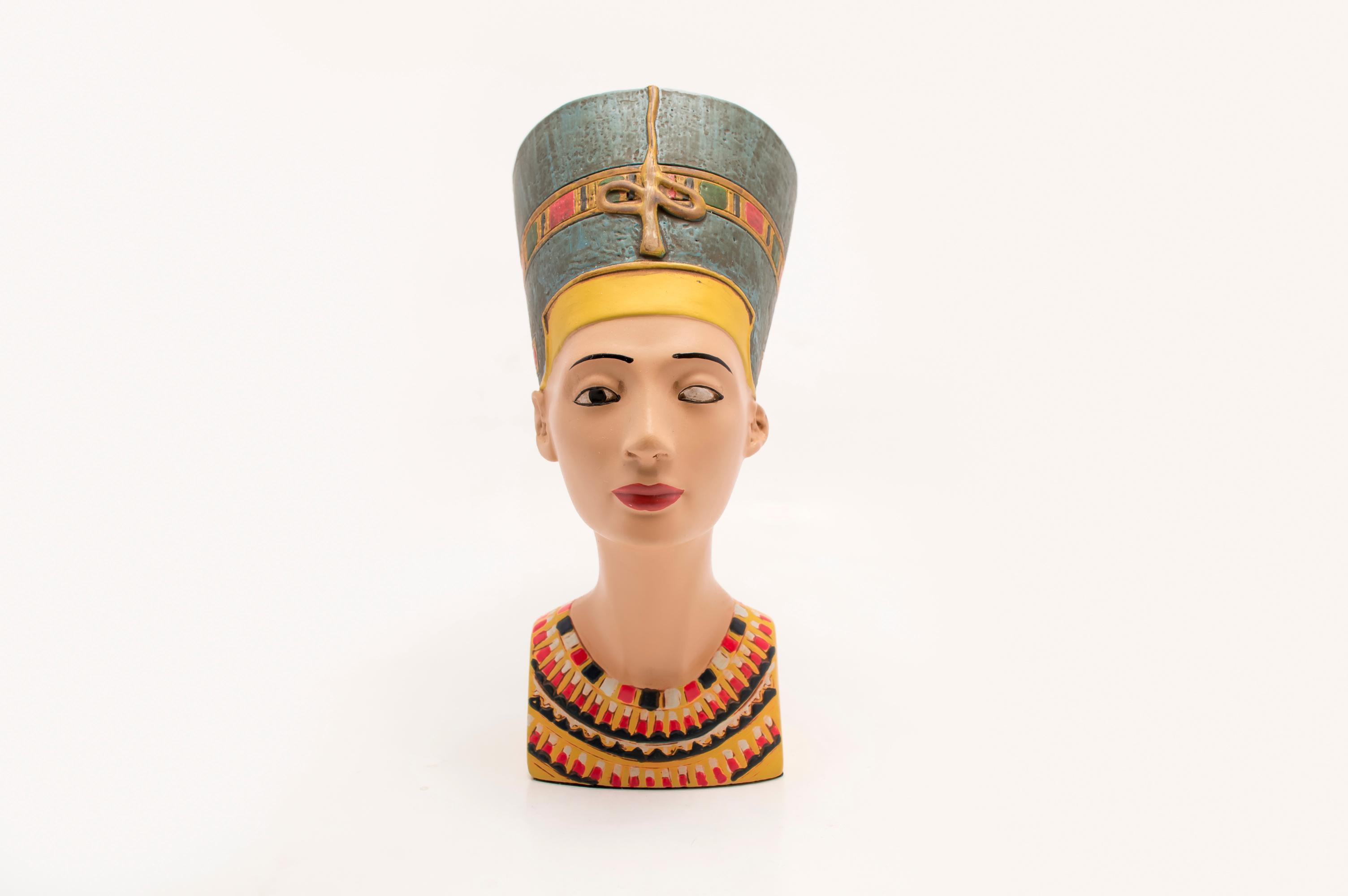 This famous sculpture known as the bust of Nefertiti was created out of limestone. It would have been made in Egypt, the New Kingdom, 18th Dynasty, ca. 1351–1334 BC. This bust was a symbol and used for ancestor worship. The colors and paint used allowed it to stay intact.