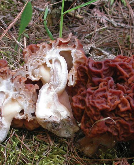 True morels are hollow inside and have a distinct pattern of pits and ridges on the outside of the cap. False morels, in the Gyromitra (jy-row-ME-tra) family, are partly hollow and partly solid inside and have an uneven, contorted body without the deep pits and ridges. Some may have a toxin that contains monomethylhydrazine, which is a lethal component of rocket fuel. I’ve found these growing both in the spring and in the fall.