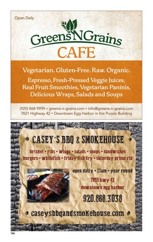 Vegetarian. Gluten-Free. Raw. Organic. Espresso, Fresh-Pressed Veggie Juices, Real Fruit Smoothies, Vegetarian Paninis, Delicious Wraps, Salads and Soups (920) 868 9999 • greens-n-grains.com • info@greens-n-grains.com 7821 Highway 42 • Downtown Egg Harbor in the Purple Building