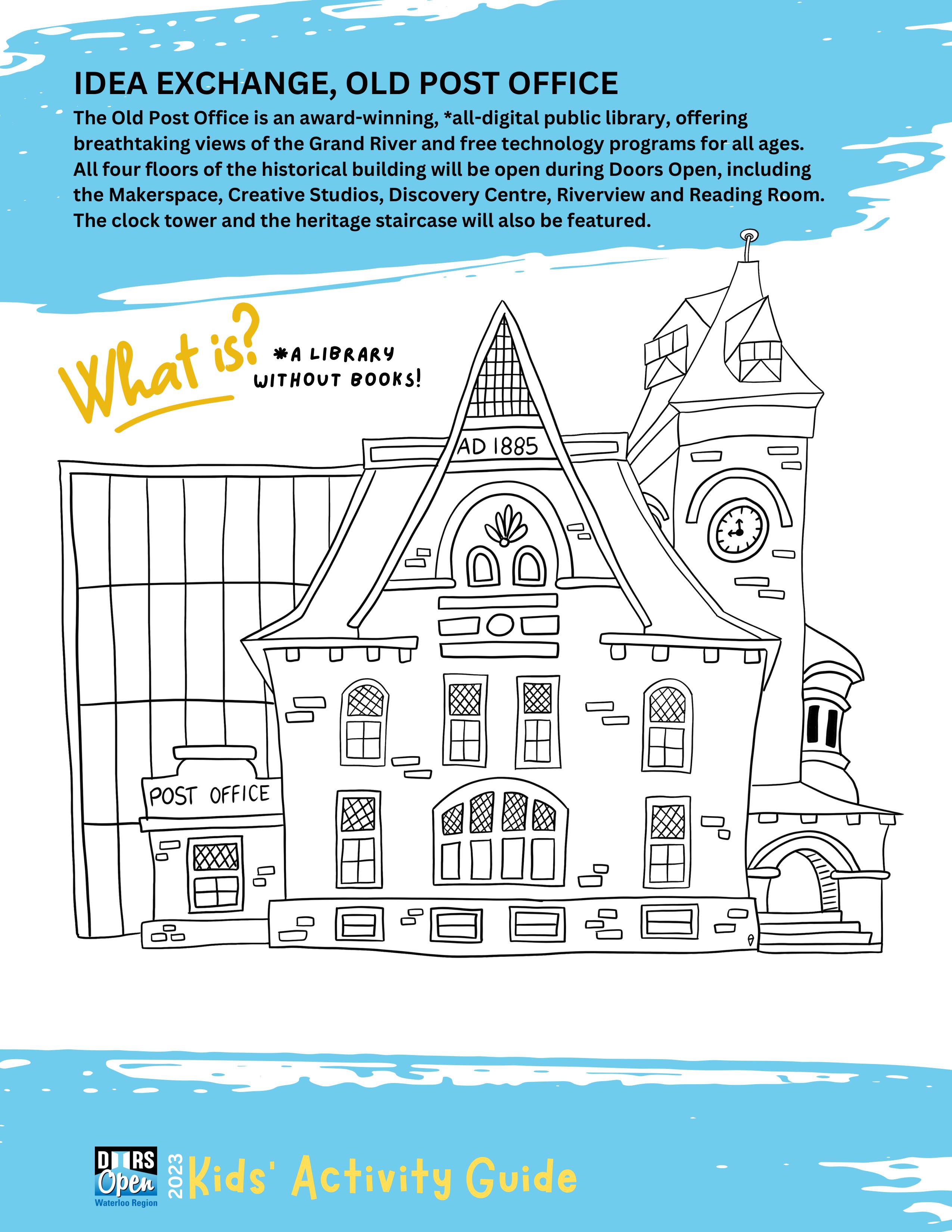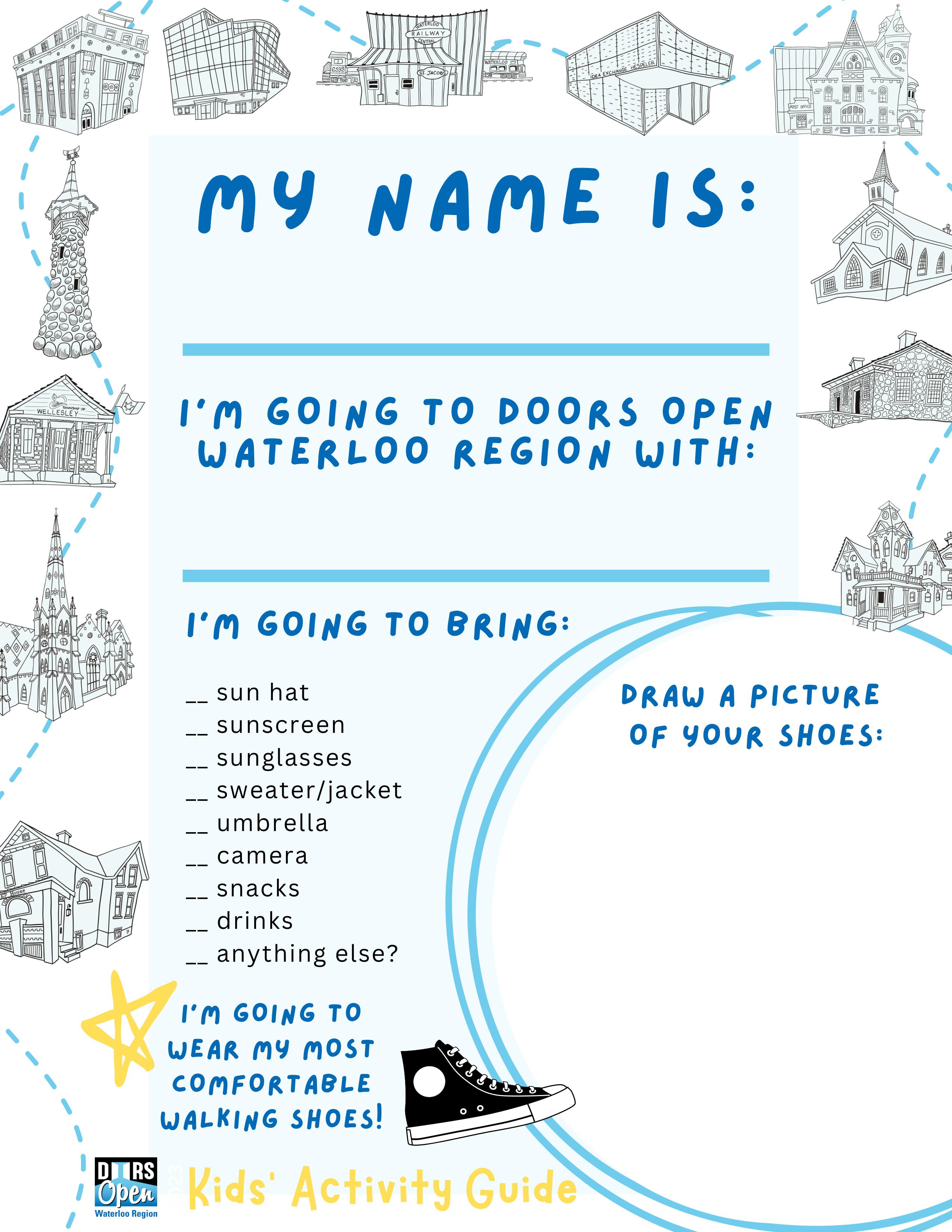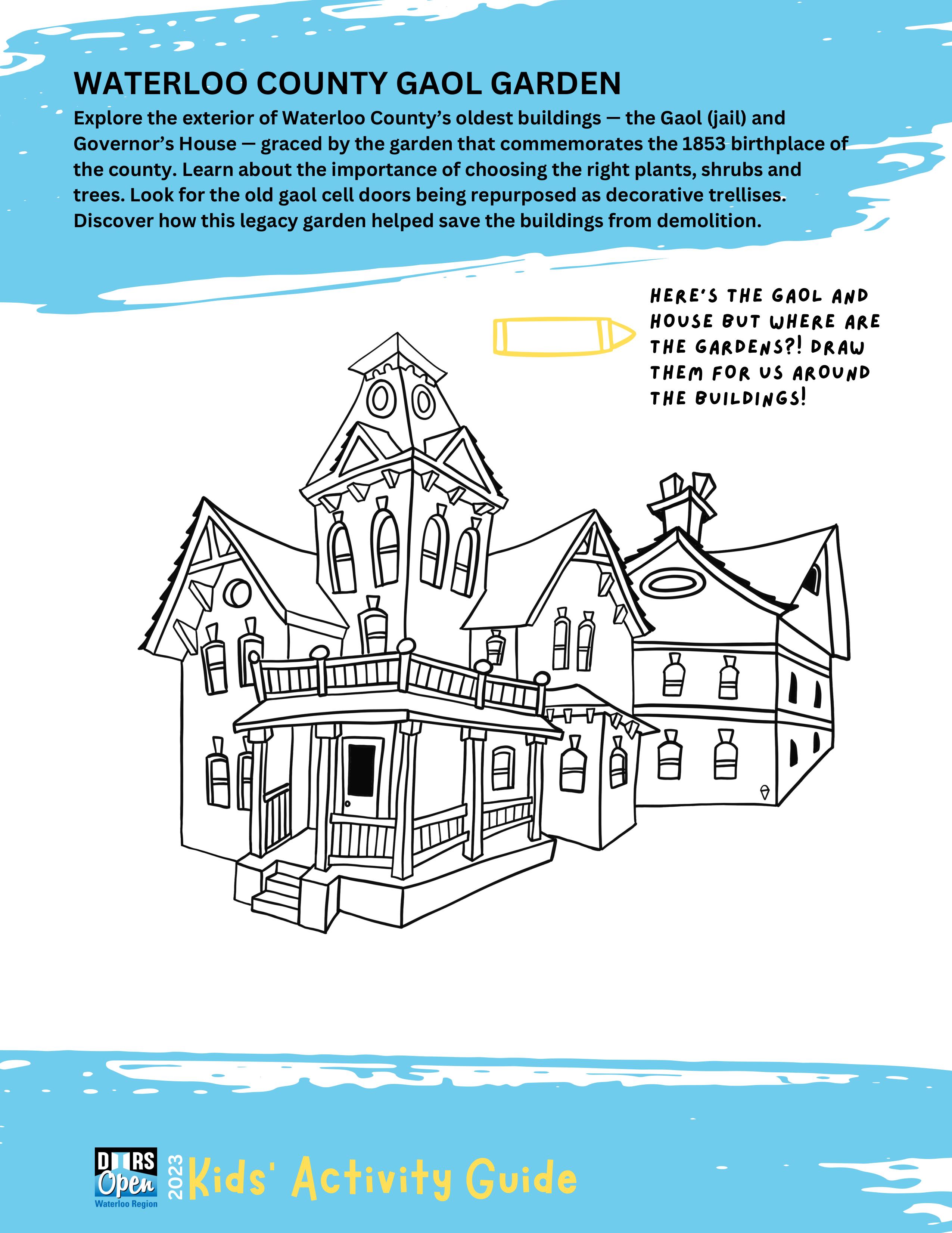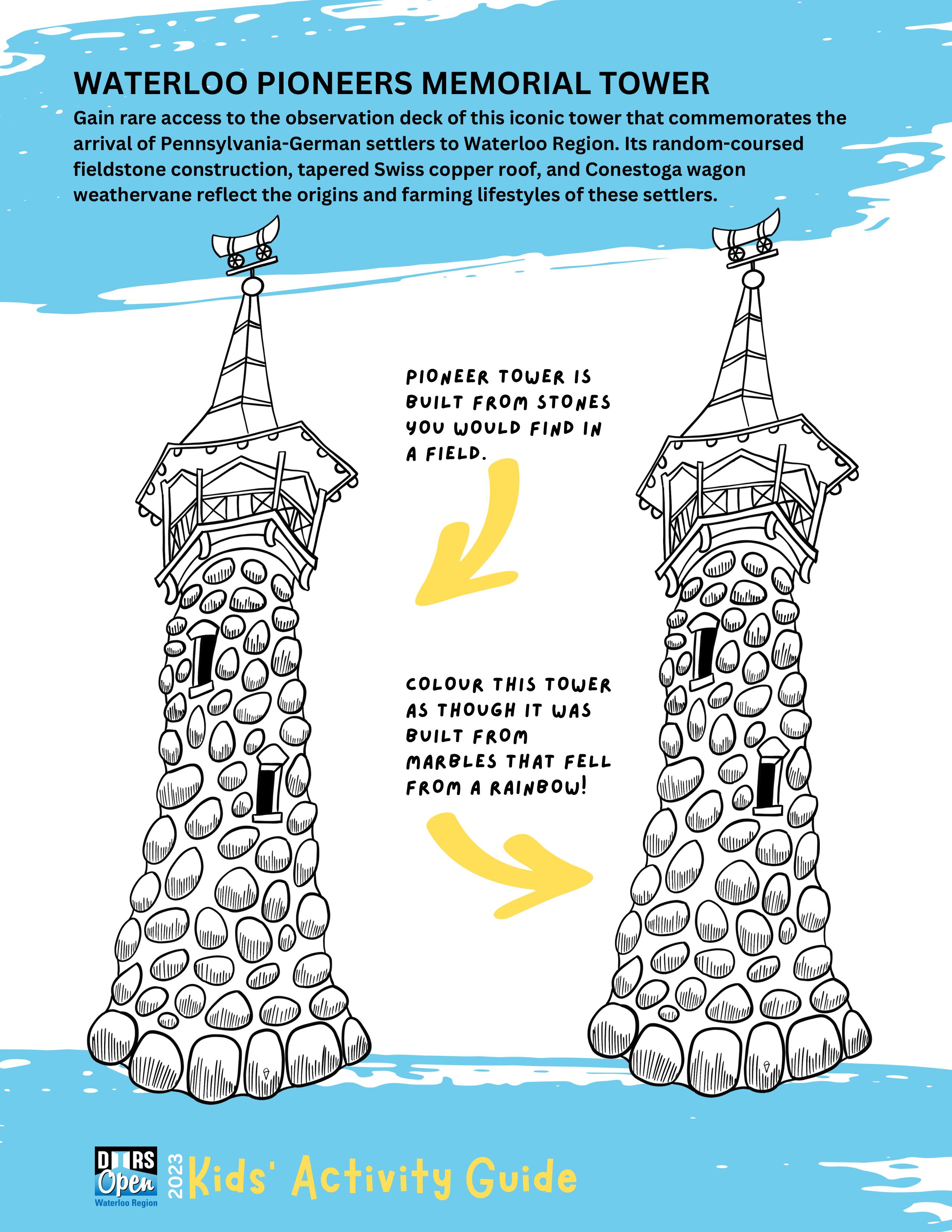 {Download & print by hitting the DOWNLOAD button above} The Doors Open Waterloo Region Kids' Activity Guide is designed to engage and educate youngsters about the 20 participating sites in the 2023 event on Saturday, September 16. The Guide features charming illustrations of each site created by local artist Della vanDokkumburg that are perfect for colouring. Fun puzzles and activities challenge kids to apply what they've learned. A perfect way to prep for the big day and a good resource year-round for engaging kids in their community.
