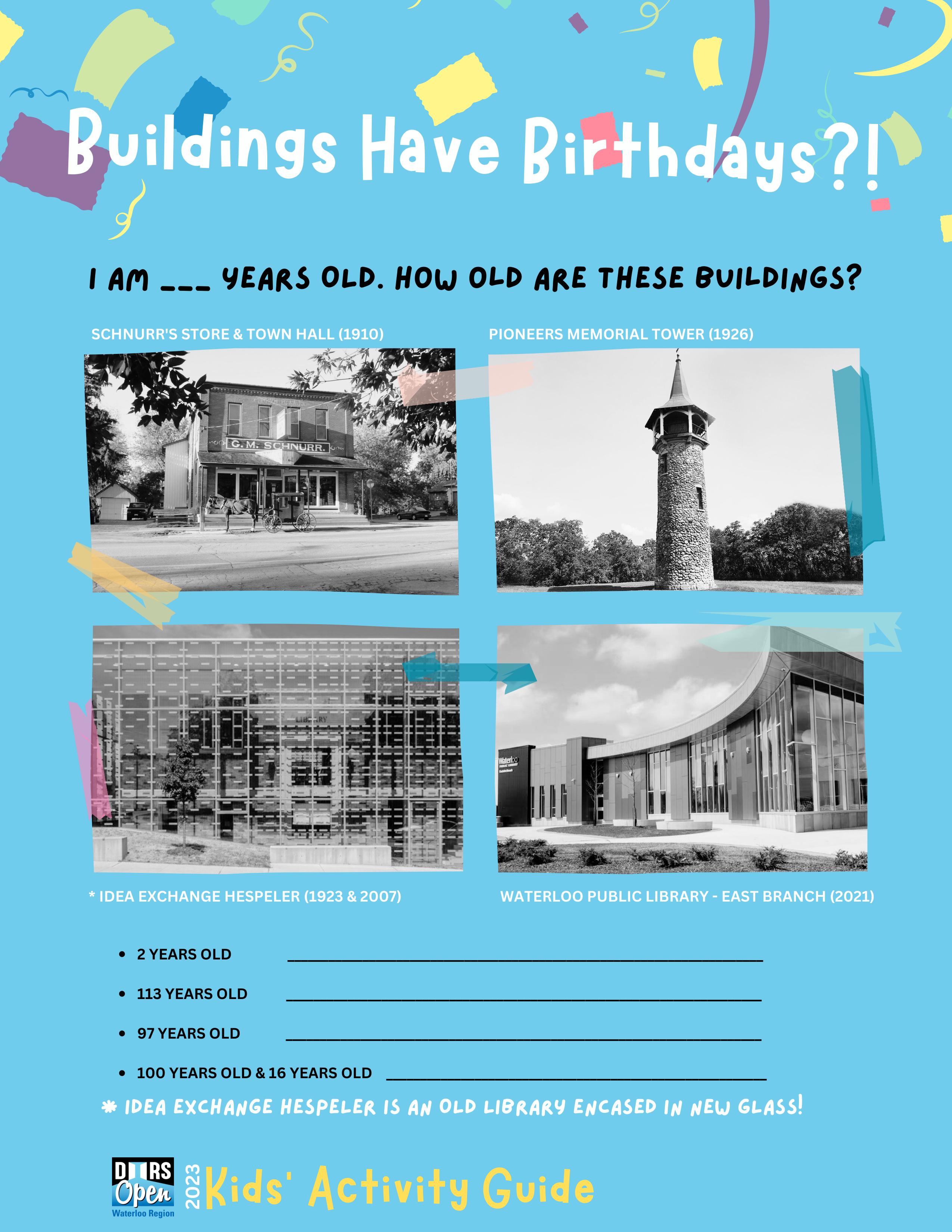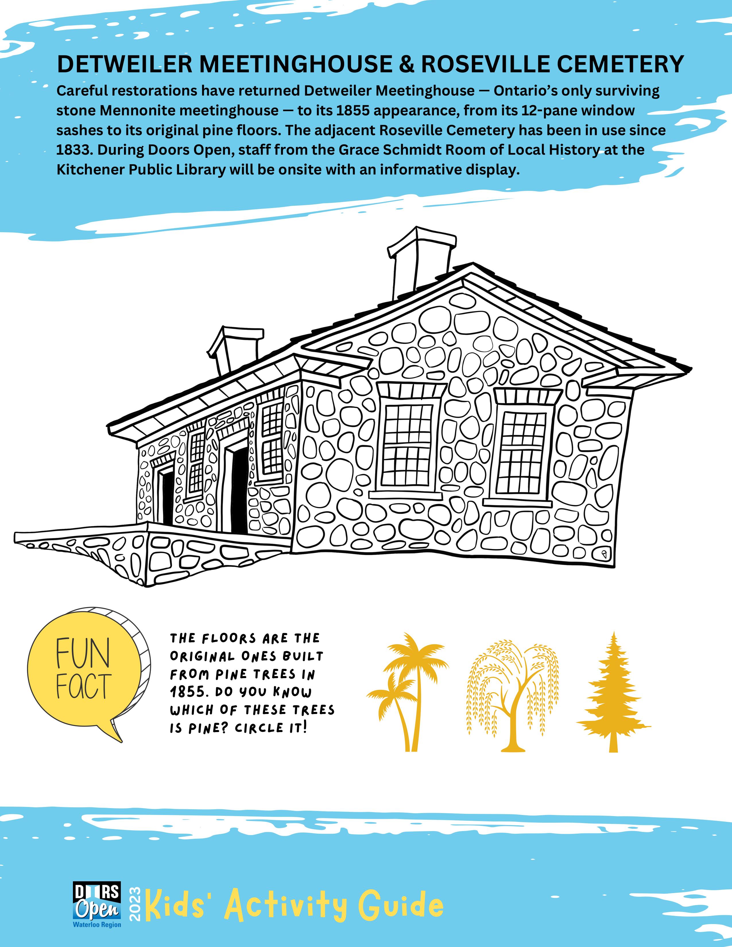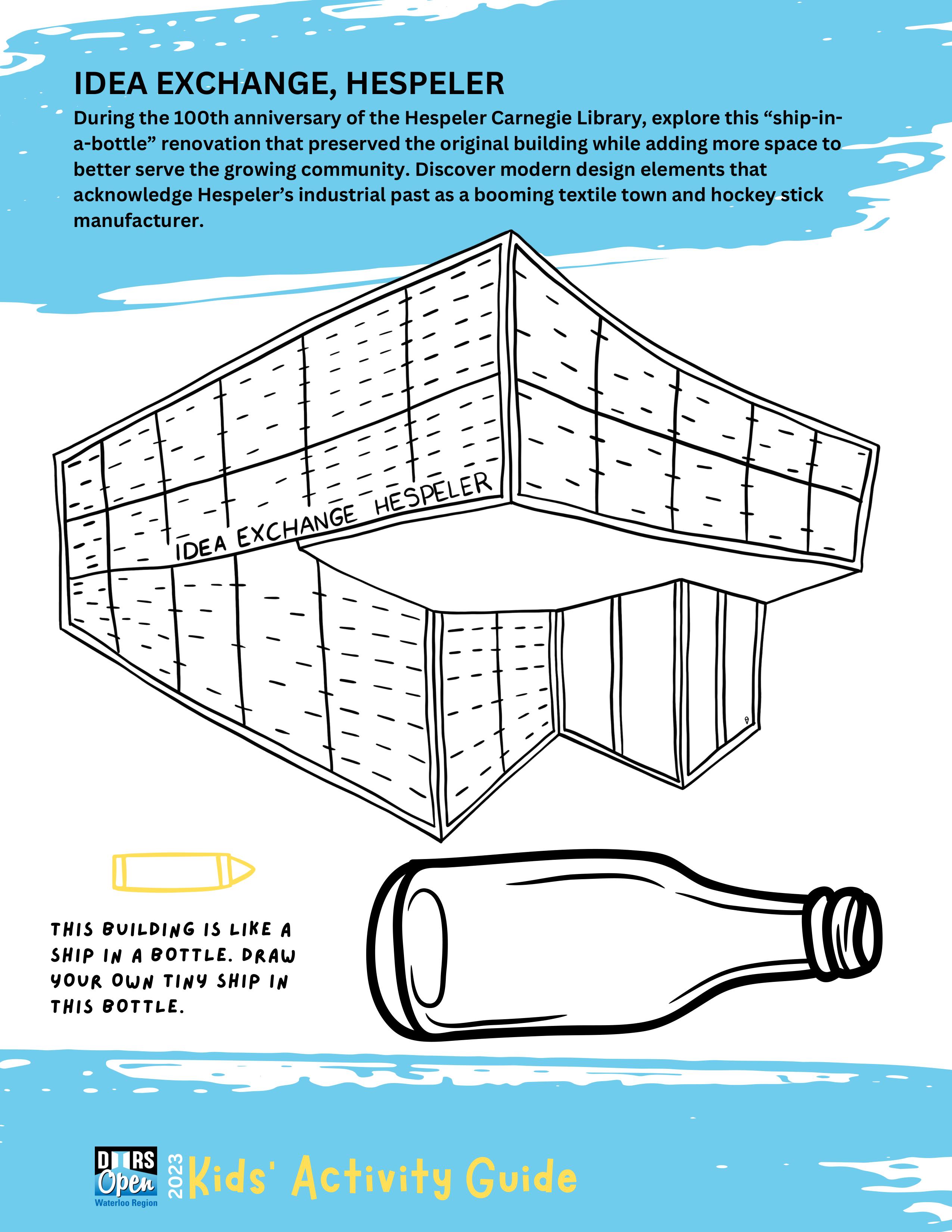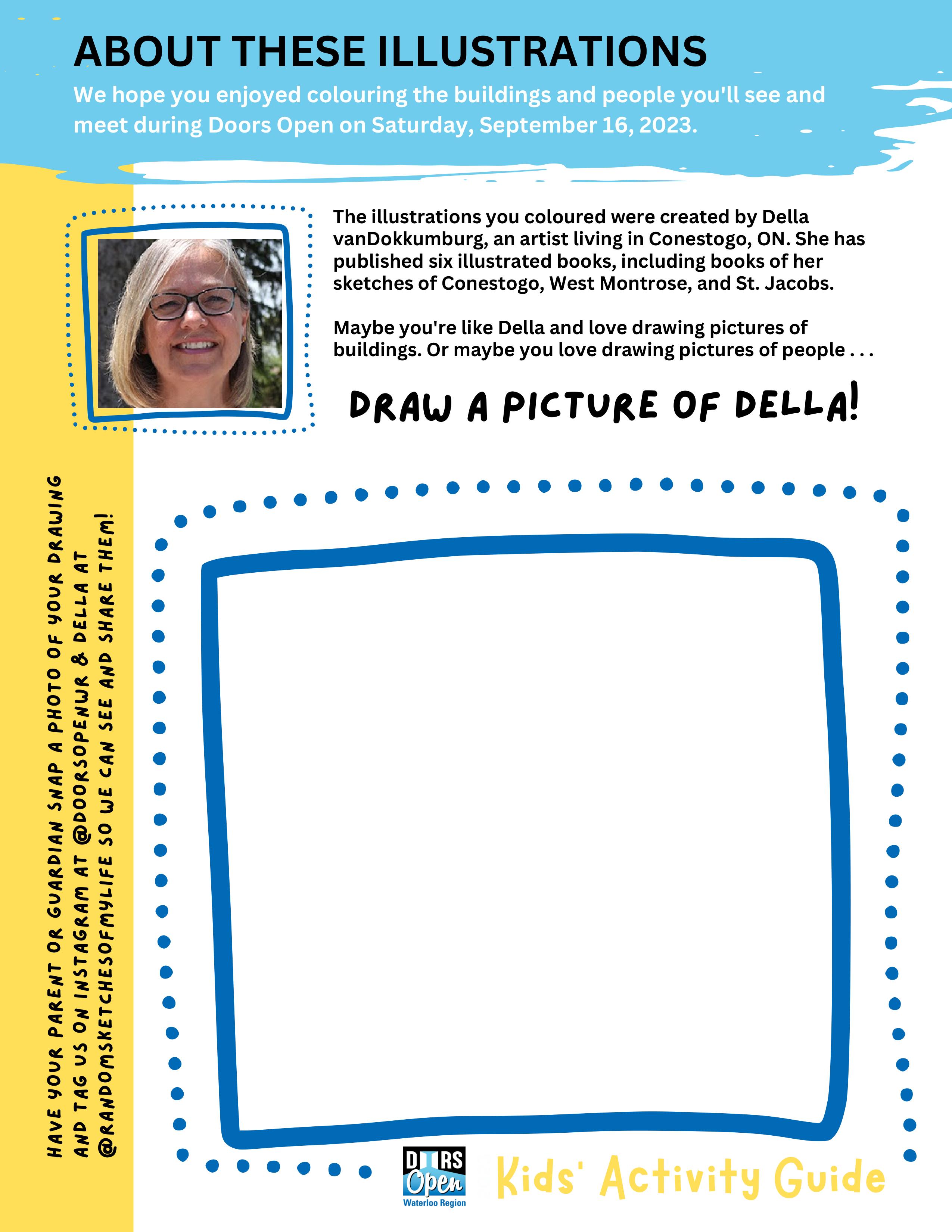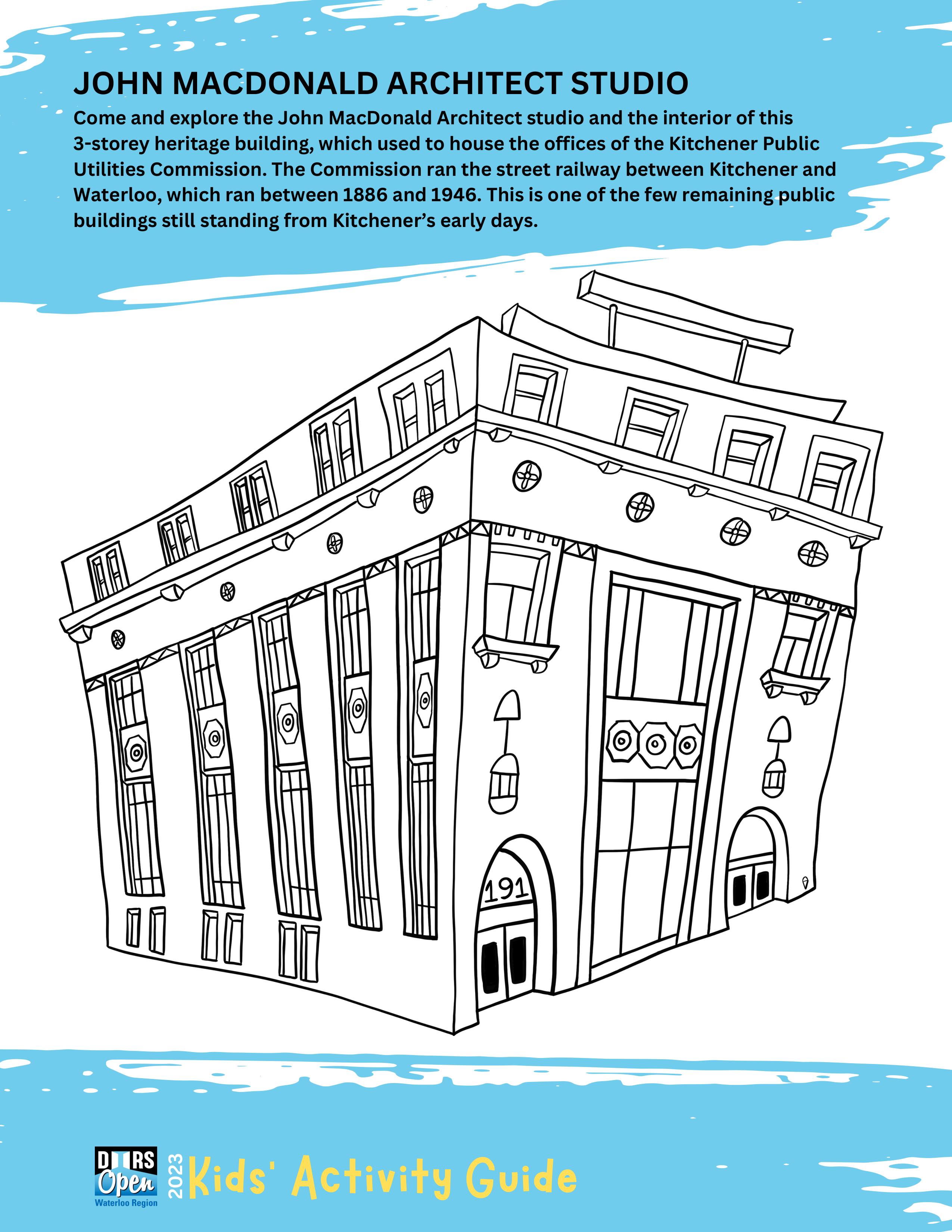 {Download & print by hitting the DOWNLOAD button above} The Doors Open Waterloo Region Kids' Activity Guide is designed to engage and educate youngsters about the 20 participating sites in the 2023 event on Saturday, September 16. The Guide features charming illustrations of each site created by local artist Della vanDokkumburg that are perfect for colouring. Fun puzzles and activities challenge kids to apply what they've learned. A perfect way to prep for the big day and a good resource year-round for engaging kids in their community.