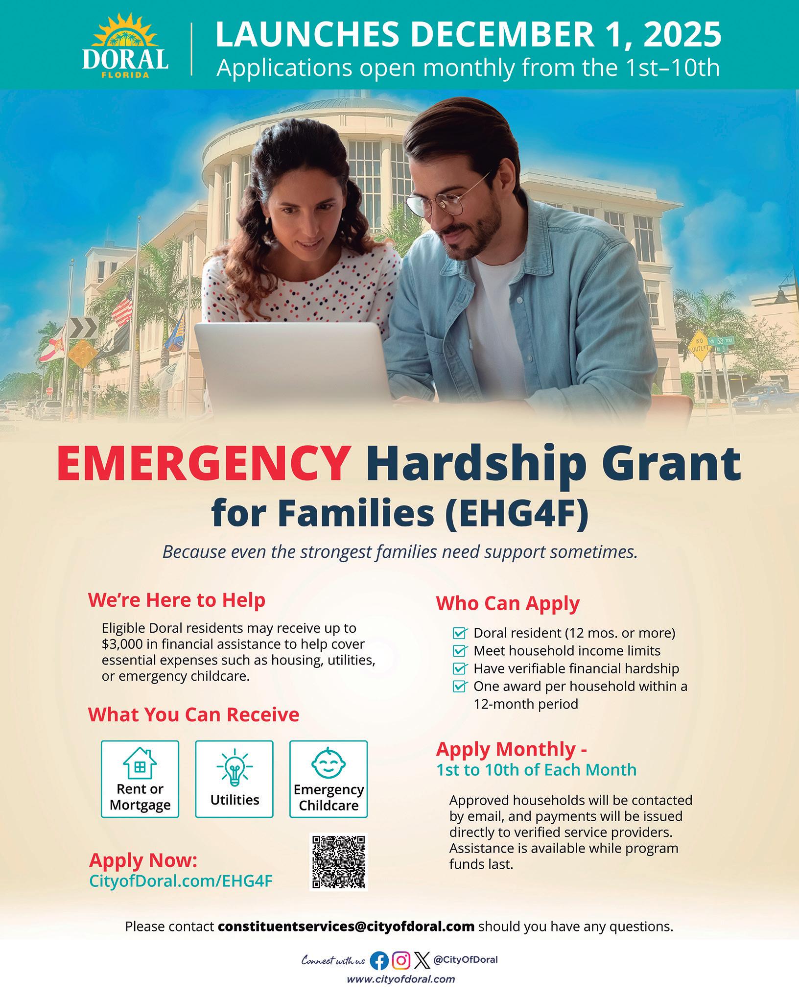 With the intention of providing direct financial assistance to residents facing verifiable economic crises, the City of Doral has launched the Emergency Hardship Grant for Families Fund (EHG4F).