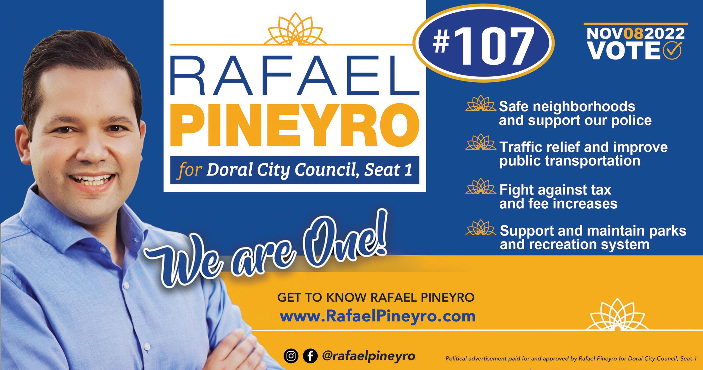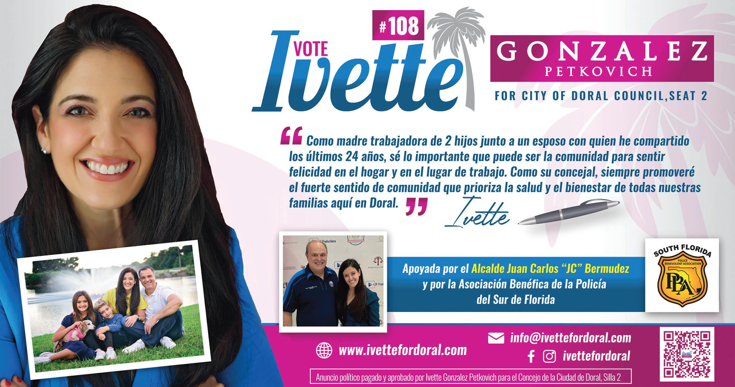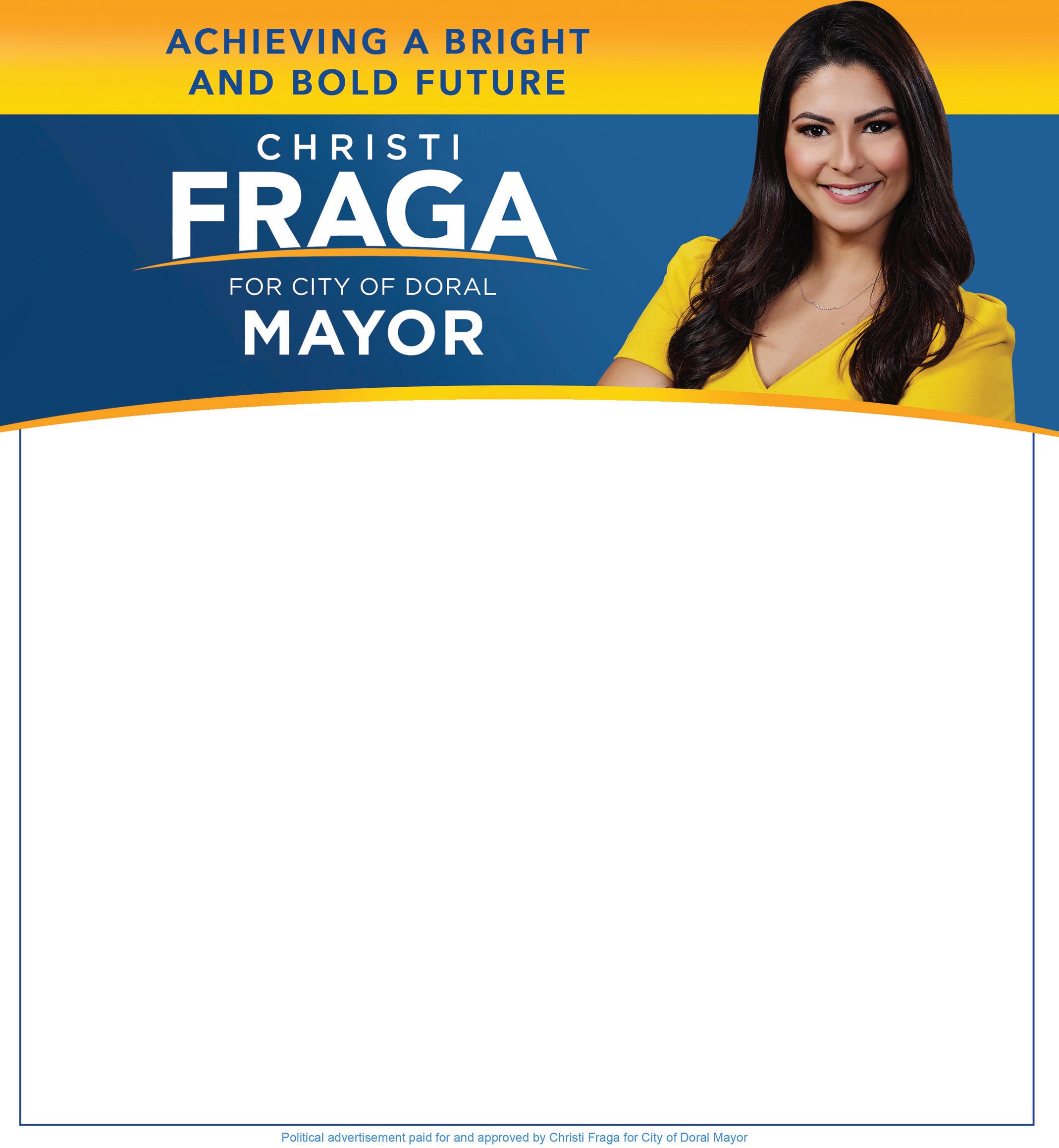 Doral is where my family and I have lived for over 20 years, it is where I grew up and am now raising my family. As a woman with profound family values, a business-owner, and a public servant, I am deeply committed to the wellbeing of our families and our city. Over the last 9 years you have honored me with the opportunity to serve you on the School Board and on the City Council these experiences along with my professional experience in finance and accounting will provide me the ability to face our city’s many challenges head-on. I believe Doral needs positive, professional and proactive leaders dedicated to working together to implement a clear and cohesive vision for the future of our city. I’ve been dedicated to improving our quality of life, and will continue to work hard in order to ensure that Doral remains a great place to live, work, learn, play and raise a family for future and present generations. That’s why I humbly ask for your trust and VOTE to serve as your next Mayor this Nov. 8, 2022!