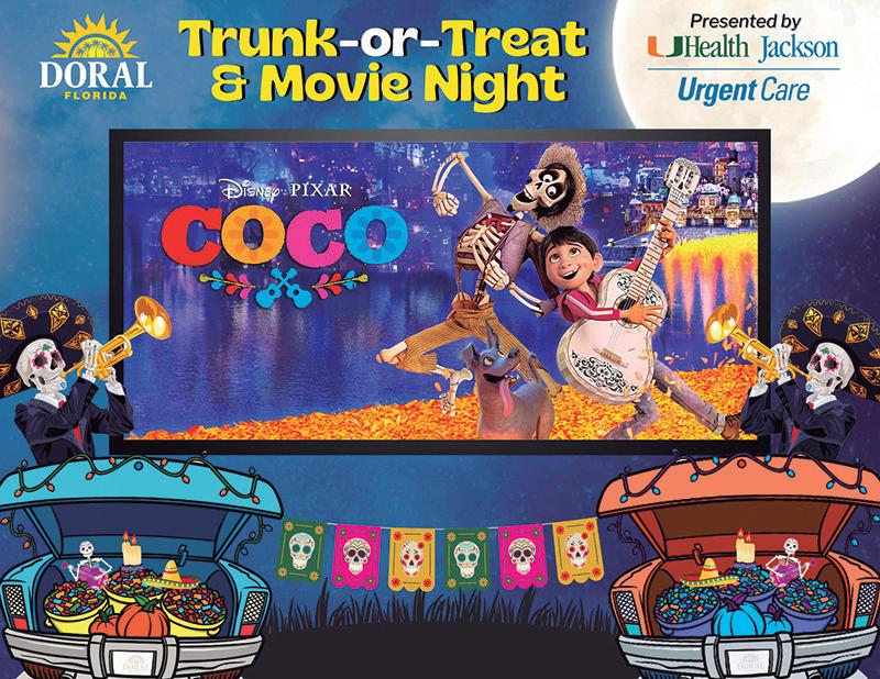 21 de octubre de 6 pm hasta 9:30 pm en Downtown Doral Park. Este evento será otra adición divertida para que familias decoren sus autos de una manera muy creativa, mientras se proyecta una película al aire libre “Coco” en la pantalla grande. El evento es gratuito y abierto al público. La comida estará disponible en el lugar para su compra. Para participar en el concurso y decorar el baúl de su carro es necesario inscribirse. La inscripción para la competencia de decoración de baúles comienza el 3 de octubre a las 12:00 p. m. en CityofDoral.EventBrite.com