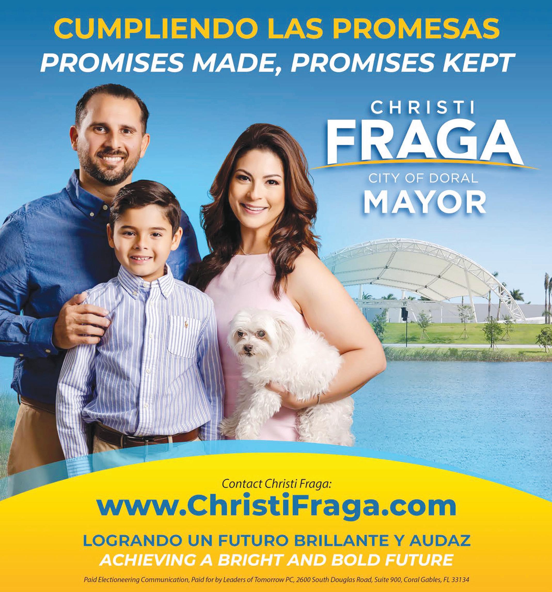 Ahora Fraga regresa con miras a ser reelegida luego de acumular varios logros en su primer término como, por ejemplo, haber revocado las pensiones vitalicias de funcionarios electos, establecido Info Doral, un centro de recursos y soluciones para ayudar a residentes y propietarios de negocios; acelerado la construcción y fecha de apertura de Doral Central Park y puesto en marcha un programa de viajes compartidos para personas mayores, entre otros.