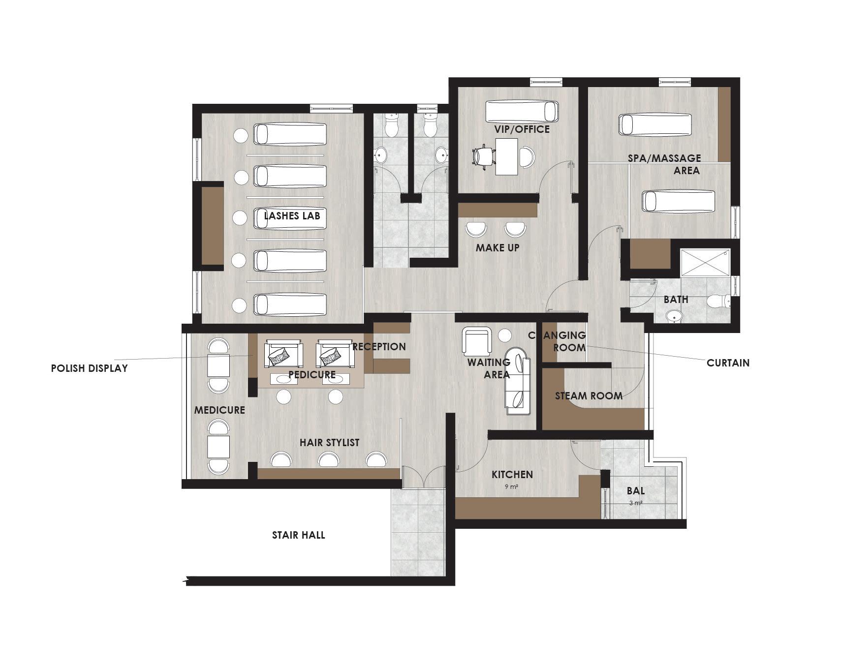 Each space is designed as comfort, picture worthy private spaces. Zoning out high activity areas such as the hair stylist, manicure and pedicure in one area, allows the spa/massage area with the sauna to have its privacy, because that is a more body sensitive space.