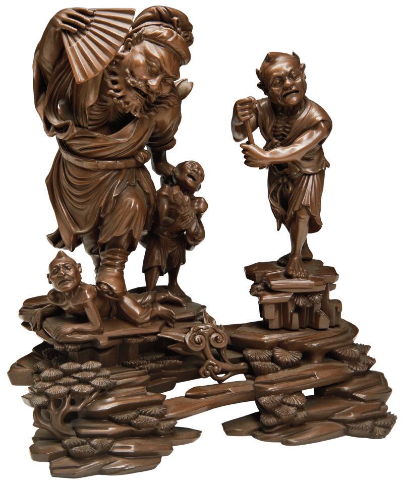A SANCAI-GLAZED RIDGE TILE AND CARVED ZITAN STAND