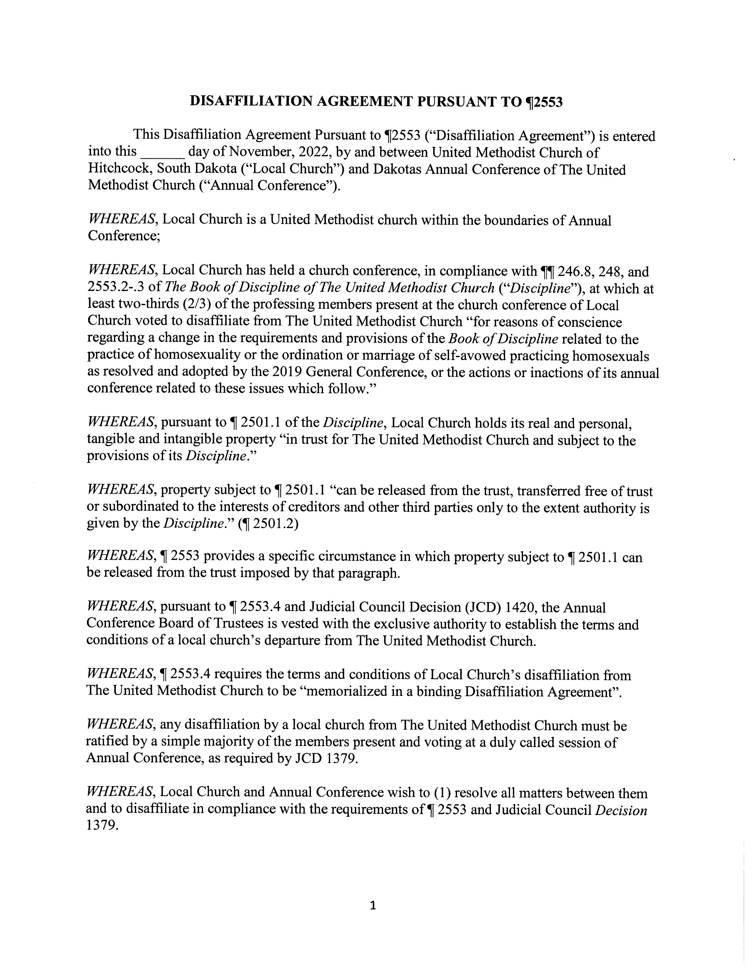 THEREFORE, having met all the requirements in a timely manner, The Conference Board of Trustees hereby, prayerfully rec ommends the ratification of disaffiliation agreement for Eureka United Methodist Church in Eureka, South Dakota. We pray for God’s favor and blessings on this ministry as we part ways.