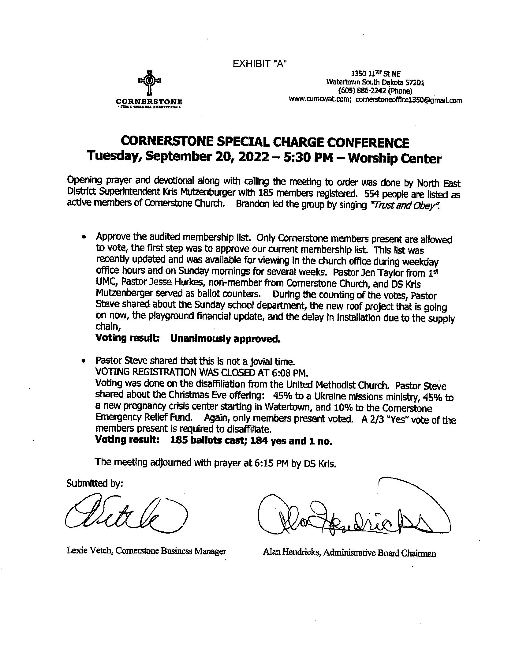 THEREFORE, having met all the requirements in a timely manner, The Conference Board of Trustees hereby, prayerfully rec ommends the ratification of disaffiliation agreement for Kennebec United Methodist Church in Kennebec, South Dakota. We pray for God’s favor and blessings on this ministry as we part ways.