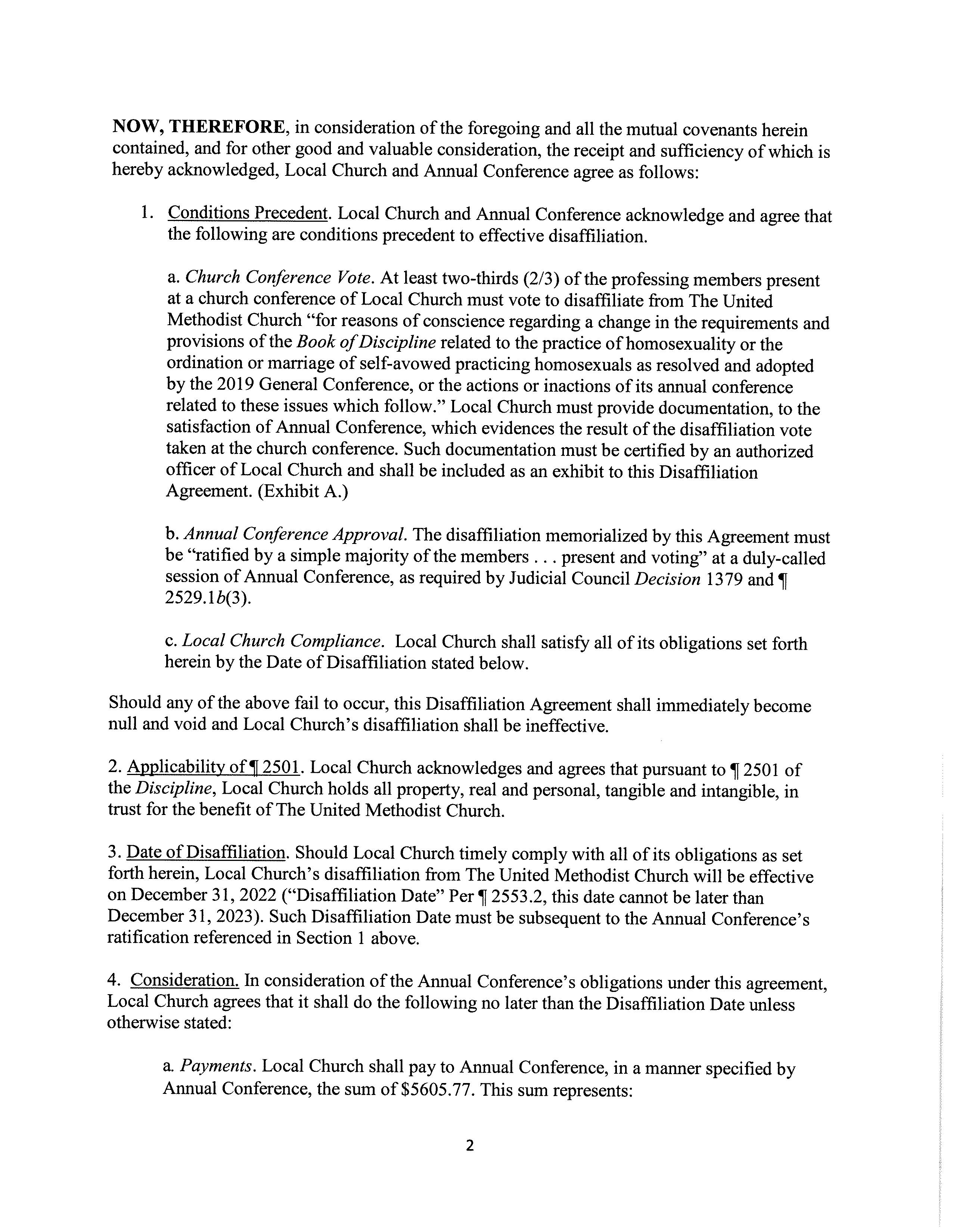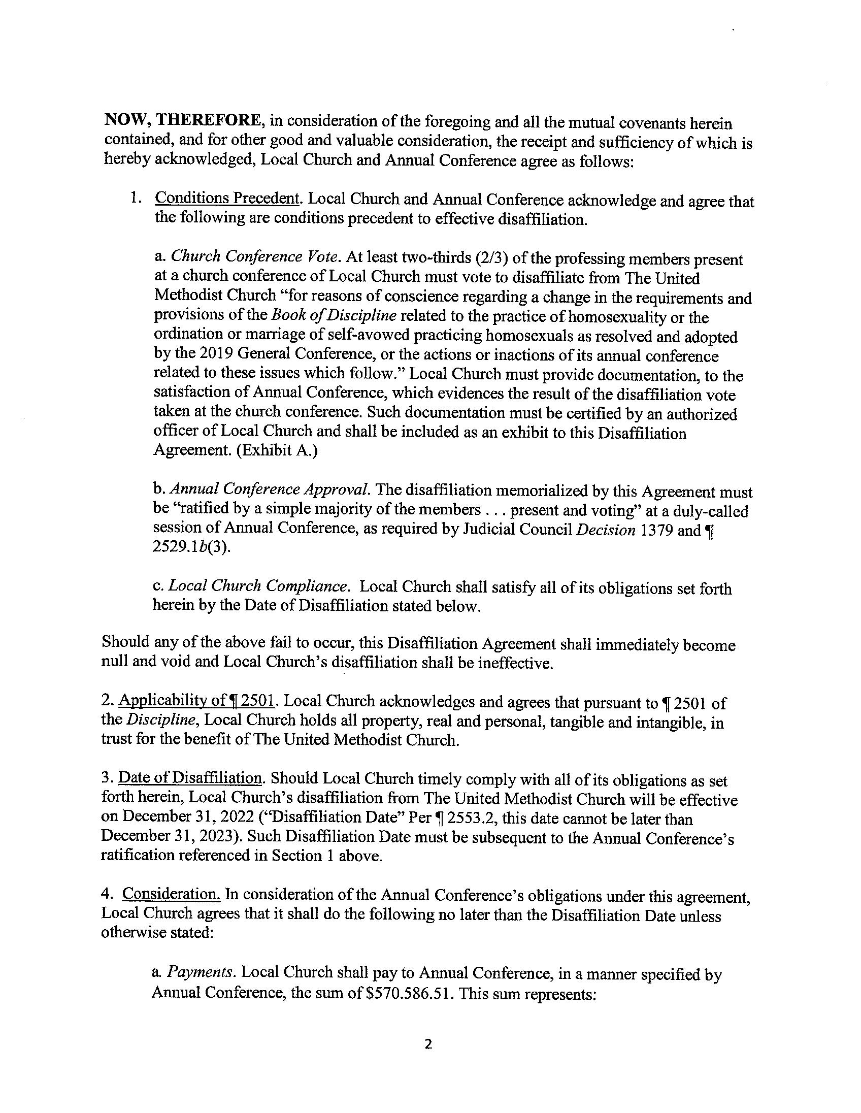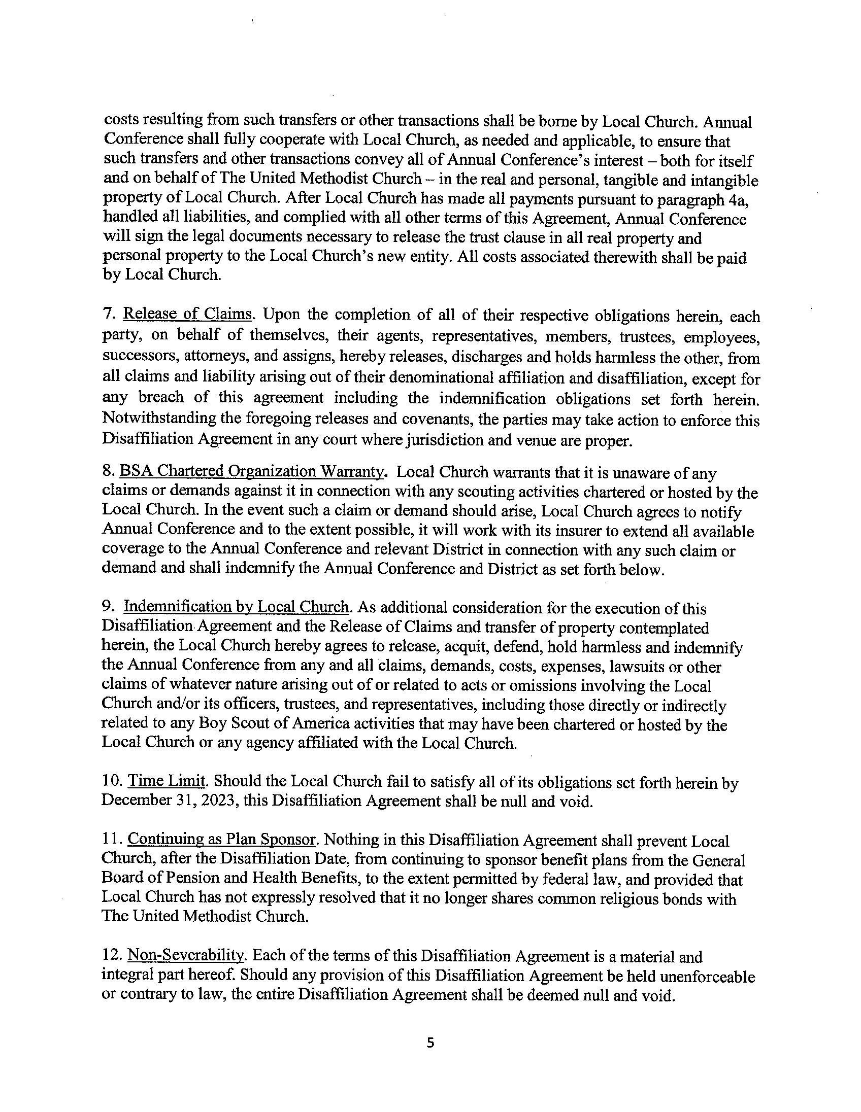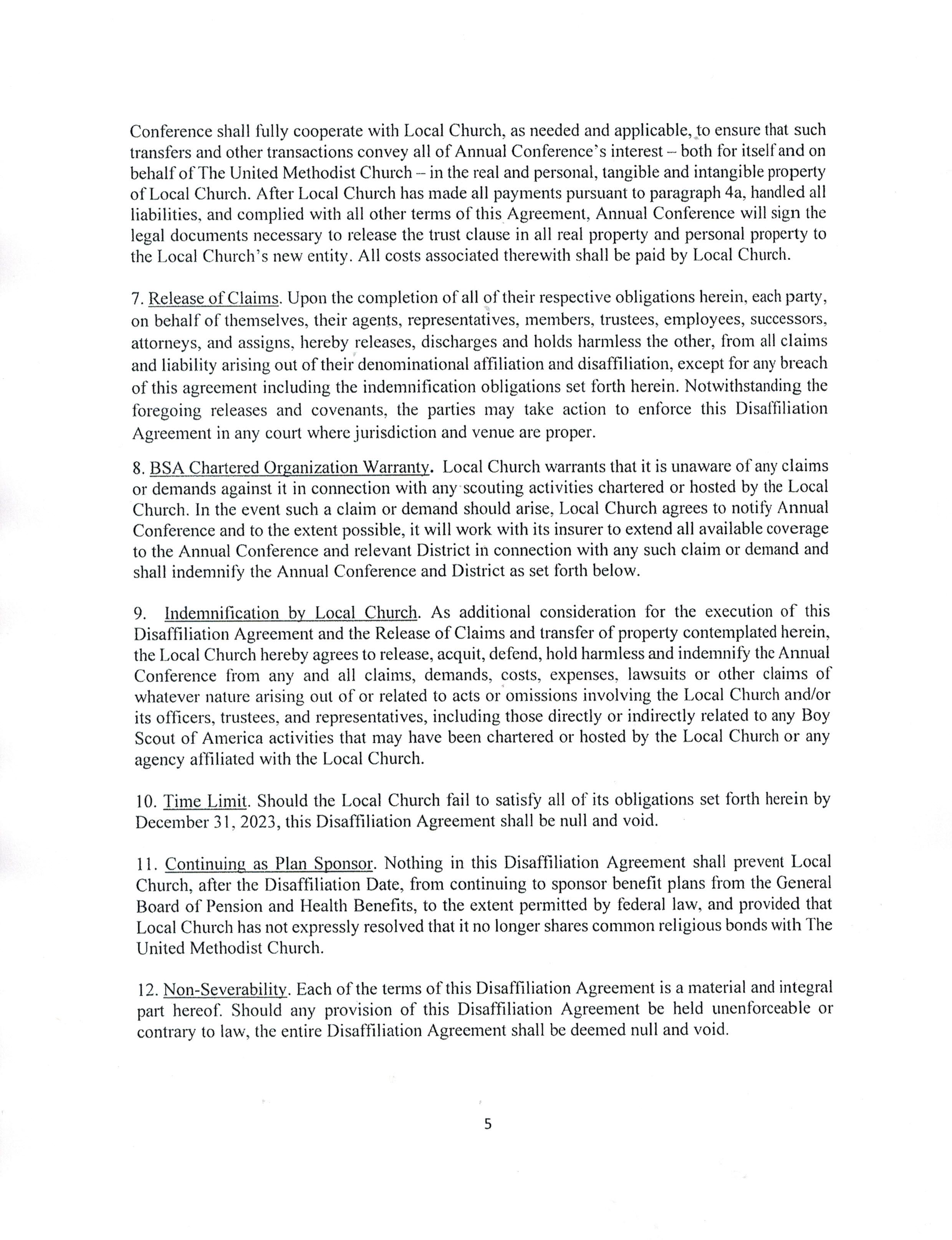 All agreements include official release from the trust clause, removal of United Methodist Church name and symbols, archiving UM records etc. Full agreement is available on the following pages for your review.