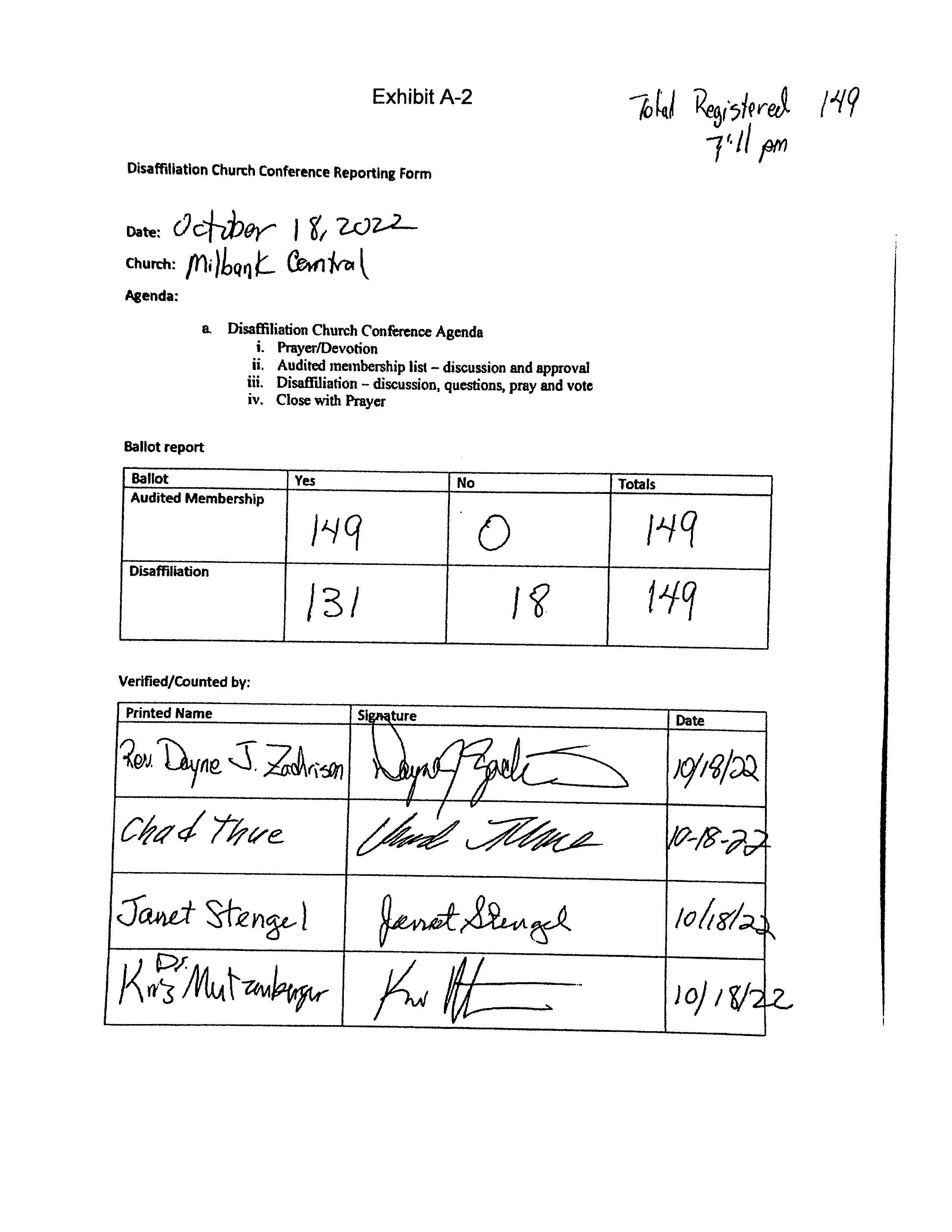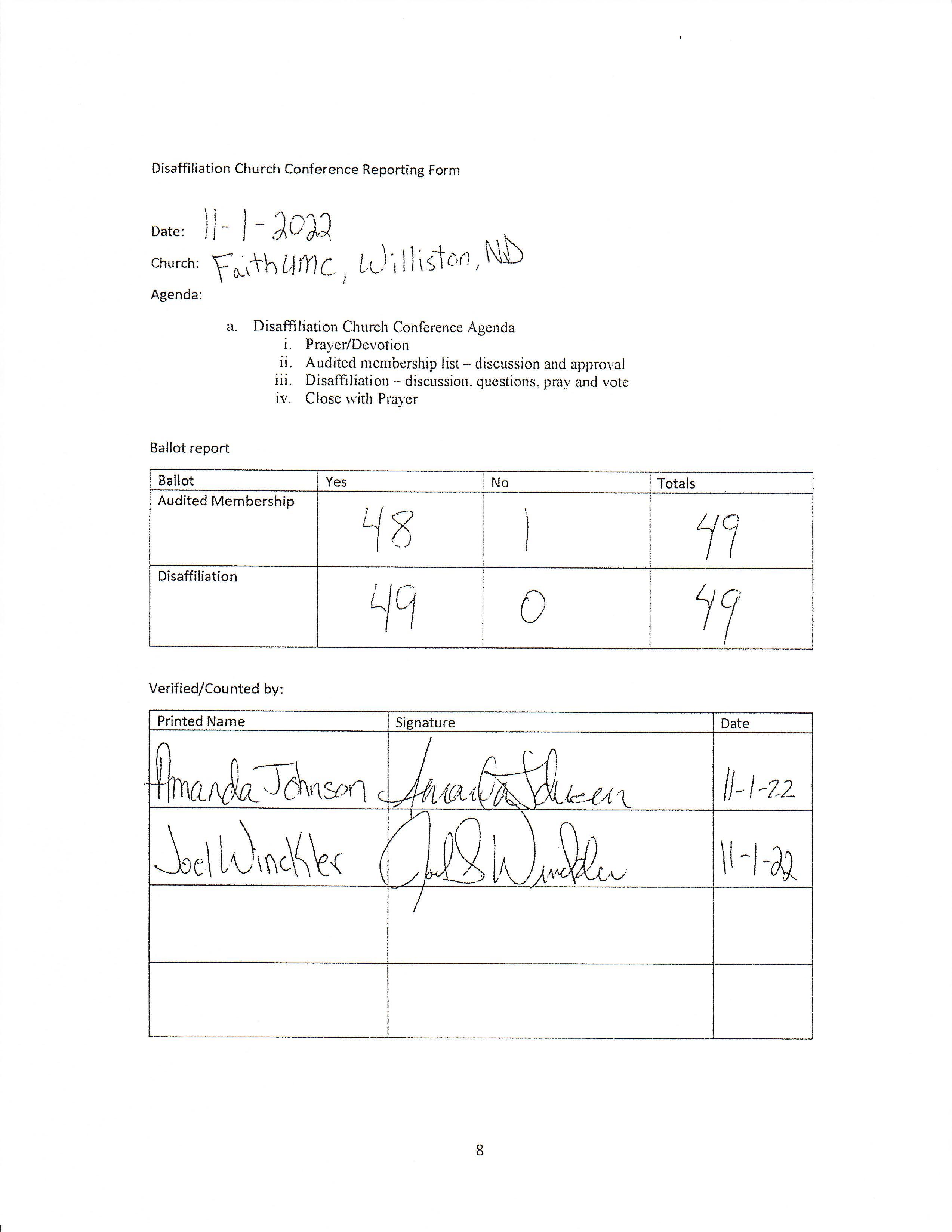 WHEREAS this local church was prompt in providing documents and meeting deadlines throughout the disaffiliation process, demonstrating their resolute commitment to disaffiliate. As such, on October 30, 2022, a Church Conference was convened, and those professing members present voted (100%) to disaffiliate from the United Methodist Church.