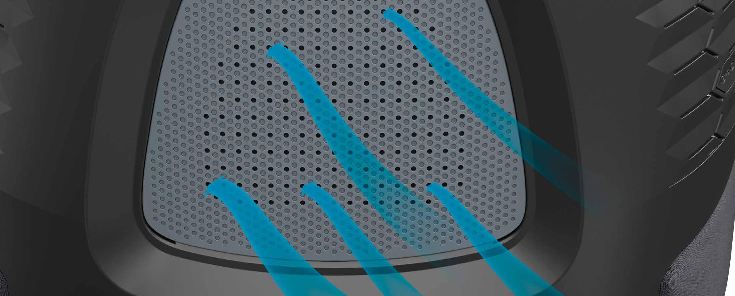 Paneles de ventilación, espuma transpirable y tejidos de rejilla que favorecen la circulación del aire y contribuyen a regular la temperatura del niño y a proporcionarles confort.