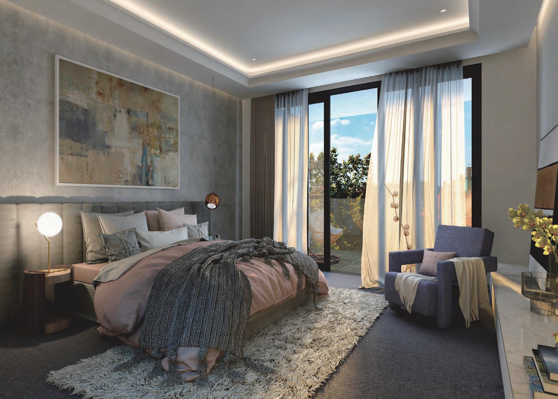 Wide balconies extend from each apartment, providing residents with private outdoor areas and panoramic city or garden views. The development offers five distinct apartment layouts along with two exclusive lofts on the top floor. The material palette of glass, metal, and textured panels brings a refined yet warm aesthetic, complementing the surrounding environment.