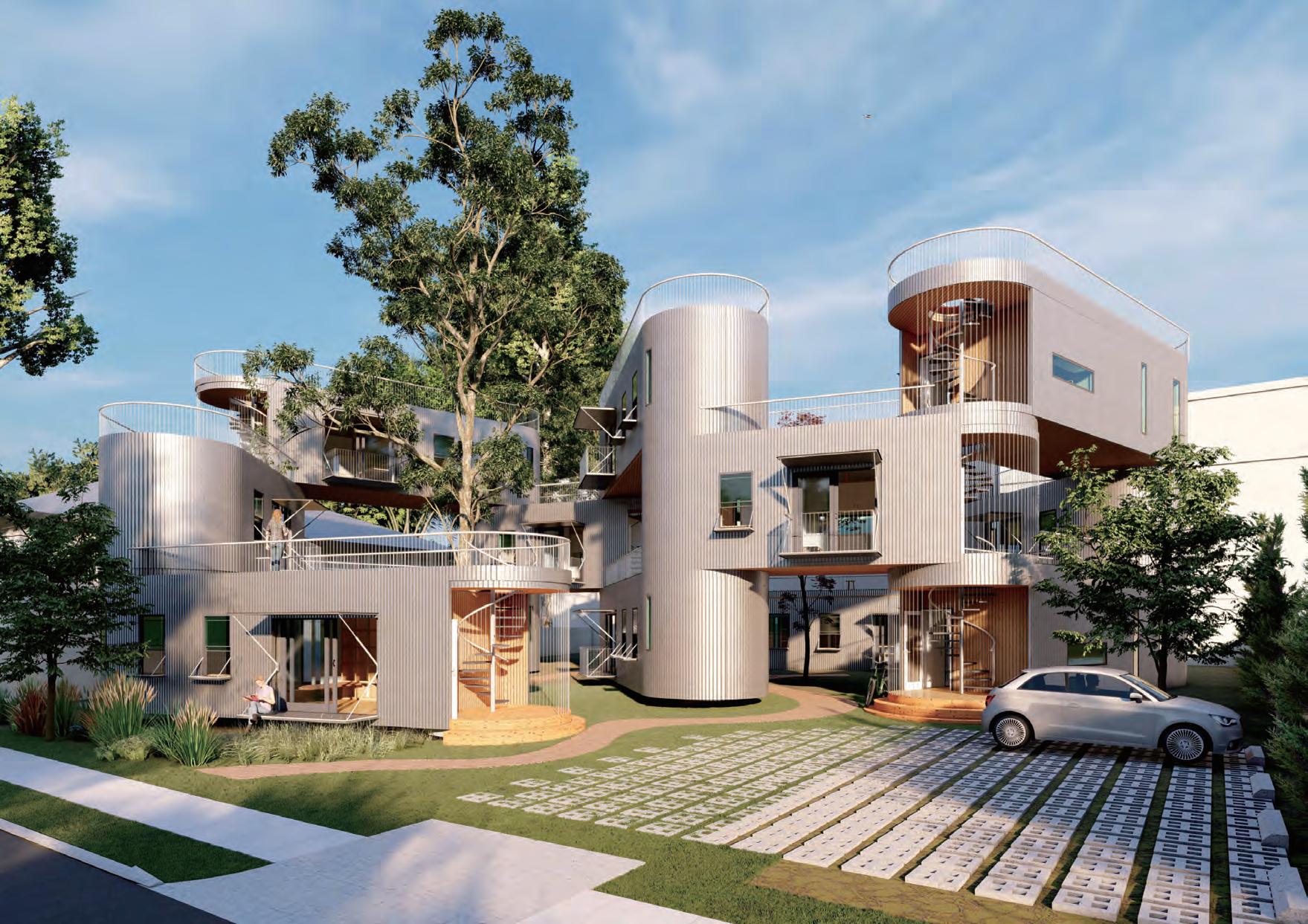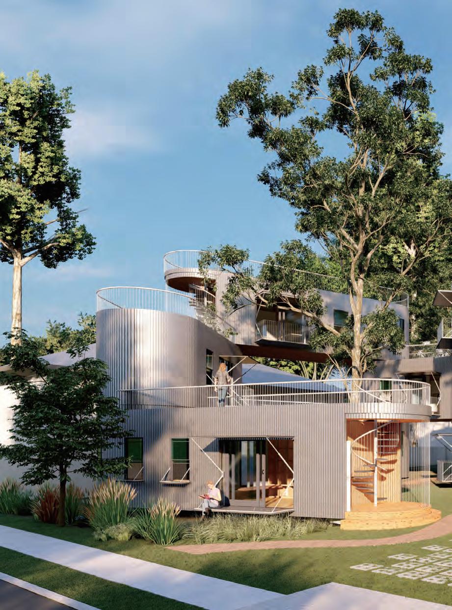 The translucent fiberglass screens along the roofline introduce soft diffused daylight while maintaining privacy. Vertical timber cladding and deep eaves contribute to a warm and inviting aesthetic, making this home a perfect fusion of sustainability and modern living.