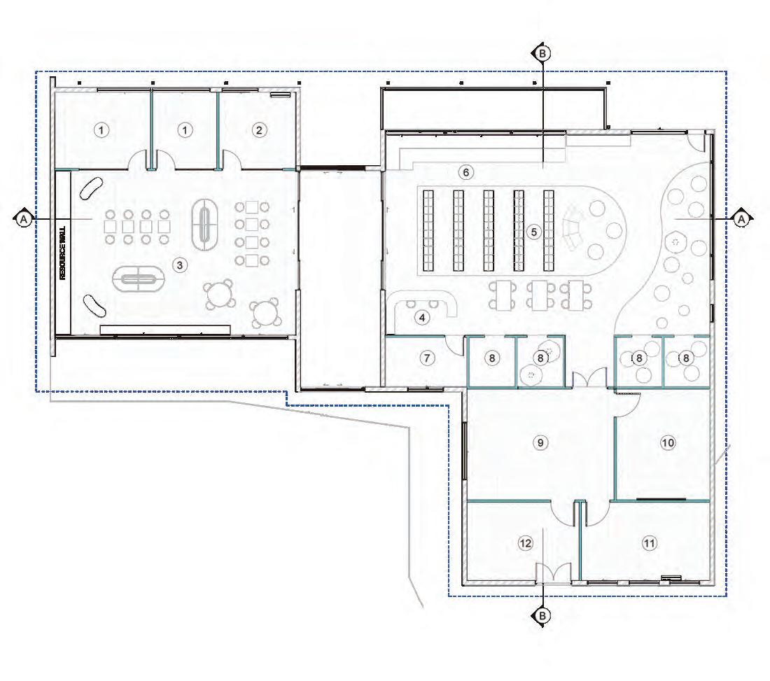 The proposed layout features new thoroughfare connecting the main quad and the Years 3-6 at the south of the campus, through the Resource Centre. This link creates natural and soft divide between the Main Library and the Learning Support Area. The Main Library features an open plan with smaller study spaces its southern edge. Behind them are nested the main staff areas, including a shared office, a resource room, meeting room and an office.
