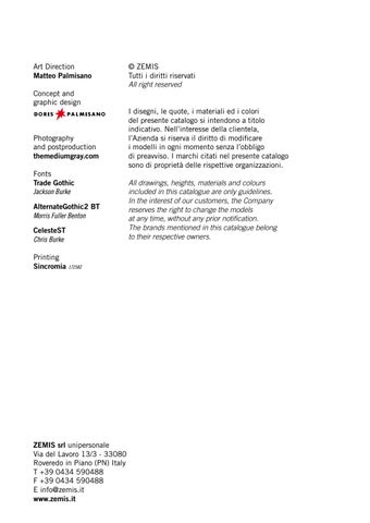 I disegni, le quote, i materiali ed i colori del presente catalogo si intendono a titolo indicativo. Nell’interesse della clientela, l’Azienda si riserva il diritto di modificare i modelli in ogni momento senza l’obbligo di preavviso. I marchi citati nel presente catalogo sono di proprietà delle rispettive organizzazioni. All drawings, heights, materials and colours included in this catalogue are only guidelines. In the interest of our customers, the Company reserves the right to change the models at any time, without any prior notification. The brands mentioned in this catalogue belong to their respective owners.