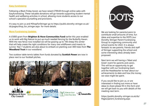 We are looking for parents/carers to contribute small amounts of time, fun ideas and expertise to the DOTS (our Dorothy Stringer Parent Fundraising Group) to organising community and school events for 2022. It is always fantastic to see parents, friends and staff of Stringer supporting the school and some interesting ideas already been proposed. Next term we will having a ‘Meet and Greet’ event for parents and carers. This will be an opportunity to get together with our fundraising team and the Headteacher to hear about our achievements to date and how the money we raise might be spent. If you would like to join us, or are interested in finding out more or have ideas to share please fill in this form and we will get back to you with details of the meeting next term. https://public.dorothy-stringer.co.uk/ds/ Pages/parent_fundraising.aspx 27