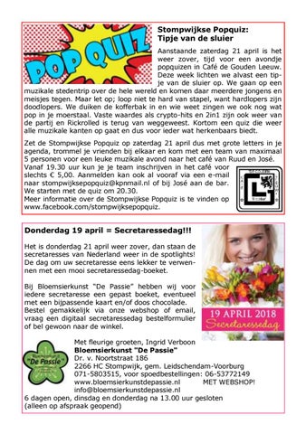 Stompwijkse Popquiz: Tipje van de sluier Aanstaande zaterdag 21 april is het weer zover, tijd voor een avondje popquizen in Café de Gouden Leeuw. Deze week lichten we alvast een tipje van de sluier op. We gaan op een muzikale stedentrip over de hele wereld en komen daar meerdere jongens en meisjes tegen. Maar let op; loop niet te hard van stapel, want hardlopers zijn doodlopers. We duiken de kofferbak in en wie weet zingen we ook nog wat pop in je moerstaal. Vaste waardes als crypto-hits en 2in1 zijn ook weer van de partij en Rickrolled is terug van weggeweest. Kortom een quiz die weer alle muzikale kanten op gaat en dus voor ieder wat herkenbaars biedt. Zet de Stompwijkse Popquiz op zaterdag 21 april dus met grote letters in je agenda, trommel je vrienden bij elkaar en kom met een team van maximaal 5 personen voor een leuke muzikale avond naar het café van Ruud en José. Vanaf 19.30 uur kun je je team inschrijven in het café voor slechts € 5,00. Aanmelden kan ook al vooraf via een e-mail naar stompwijksepopquiz@kpnmail.nl of bij José aan de bar. We starten met de quiz om 20.30. Meer informatie over de Stompwijkse Popquiz is te vinden op www.facebook.com/stompwijksepopquiz.