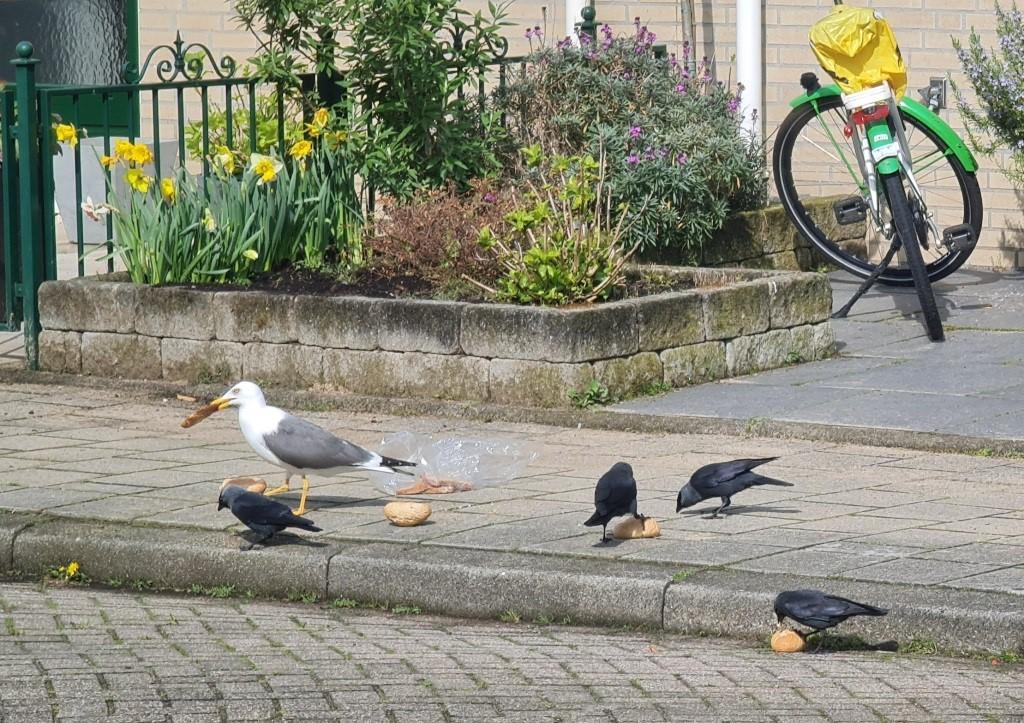 Ik weet niet welke reukorganen er in de snavels van een vogel zitten, maar binnen de kortst mogelijke keren waren de broodjes uit het zakje en zaten de kauwen en een meeuw aan een gezamenlijk ontbijt. Petra