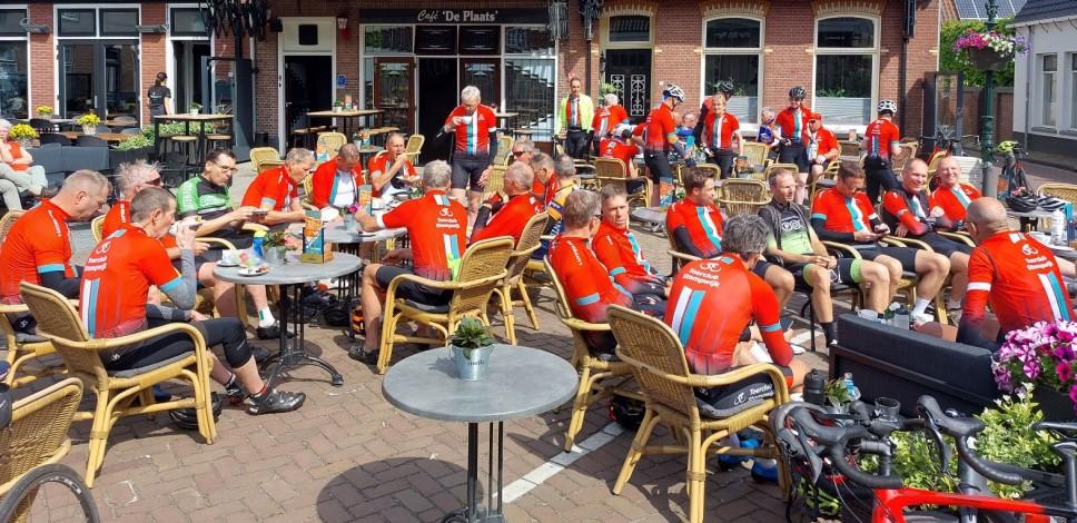 Op deze 2e Pinksterdag was het weer even omschakelen na het lekkere warme weer op zondag. Vanmorgen nog weinig zon en een frisse noordenwind. Zo’n 70 fietsers aan de start die er niet allemaal op gerekend hadden. Ik zag korte broeken enmouwen, maar ook jasjes en lange broeken. De A1 vertrok met 14 man voor de rit naar een nieuwe koffietent midden in Montfoort. Het is de vervanger van de stop nabij IJsselstein, dus daarom die rit van vorig jaar er maar even bij gezocht. Deze vervolgens omgedraaid en een beetje aangepast, zodat we het langste stuk voor de koffie hadden en we niet te vroeg zouden arriveren. Zo reden we verschillende stukken op de heenweg die we meestal juist op de terugweg rijden. Zoals van Bodegraven via Woerden naar Harmelen. Dan hoor je af en toe zeggen: “Oh, zitten we hier.” Het ziet er altijd weer anders uit van de andere kant. Het pleintje in Montfoort kleurde al snel rood van de Toerclub -shirtjes, want ook de A3 en A2 hadden het kunnen vinden. Een mooi gezicht. Inmiddels was het wel zonnig geworden en gingen wat armstukken uit, maar de meeste windstoppers nog niet. Op de terugweg nog even door het oude centrum van Montfoort en Oudewater en daarna rap langs de A12 op Stompn 110km reed ik de Meerlaan weer op.