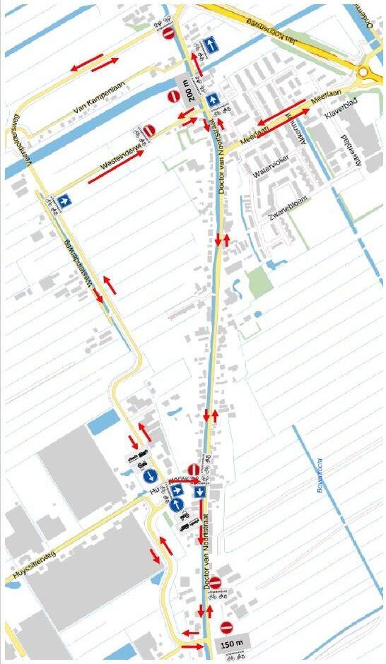 Bestemmingsverkeer kan nog wel vanaf de Veenpoldersweg de Doctor van Noortstraat bereiken via de Huyssittersweg en de Westeinderweg. Tussen de Huyssittersweg en Doctor van Noortstraat 10 en tussen de Westeinderweg het dorp uit richting de N206 is het bestemmingsverkeer in 1 richting toegankelijk. Op het kaartje is te zien hoe de eenrichtingsverkeerstructuur eruitziet.