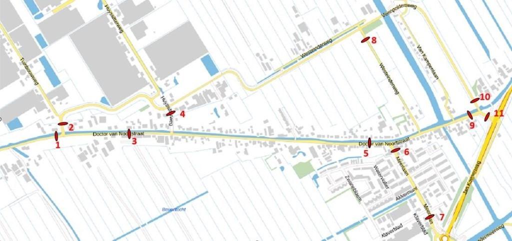 Halverwege juli startte de pilot eenrichtingsverkeer op een deel van de Doctor van Noortstraat in Stompwijk. Belangrijkste doel van deze pilot is om het doorgaande verkeer te weren in het dorp en via de Veenpoldersweg om het dorp te laten rijden. Om te beoordelen wat het effect is van de pilot, gaat de gemeente op 11 locaties verkeersmetingen uitvoeren (zie afbeelding voor meetlocaties).