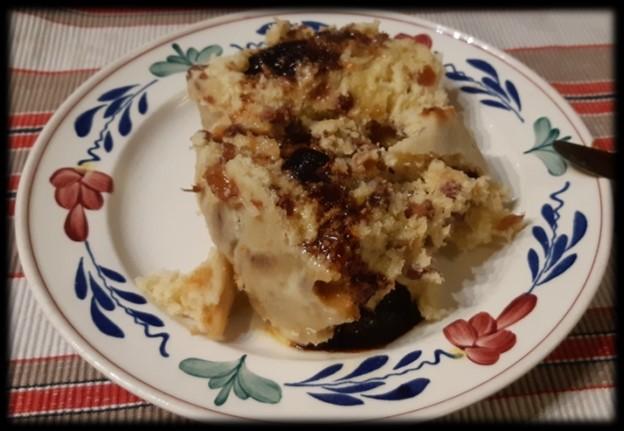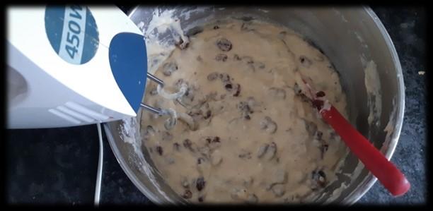 Laat de rozijnen (en eventueel krenten) wellen in heet water, droog ze daarna. Doe alle ingrediënten behalve de rozijnen/krenten in een kom en mix door elkaar. Als laatste de rozijnen/krenten er door roeren. Doe het beslag in een zak gemaakt van ongebleekte katoen of grof linnen (deze zak eerst even in heet water dompelen alvorens te vullen).