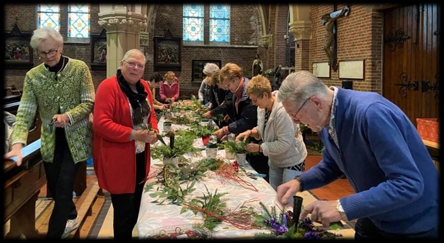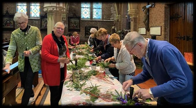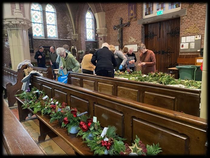 Ook dit jaar werden er namens de Laurentiusparochie kerststukjes gemaakt voor de ouderen en de mensen die even een hart onder de riem nodig hebben vanwege ziekte of andere moeilijke omstandigheden. Als ik om 10.00 uur de kerk binnenloop, zeg maar de starttijd, staat daar al een lange tafel klaar en ligt er heel veel kerstgroen en materiaal om de stukken te maken.