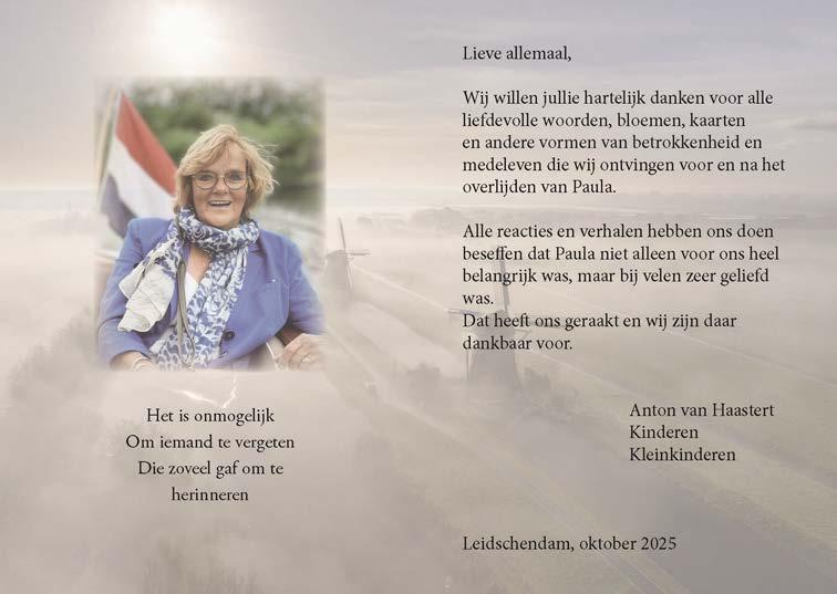 Voor de overleden armen en weldoeners van onze parochie, Kees van Dijk, Aad van Dijk, Willem van Dijk, Jaap Verburg, Adrie van Nierop, Nelly Ammerlaan- Overgaauw, Peter van Leeuwen, Joop Hilgersom, Jeannette Develing- Roest, Kees Knijnenburg, Leo van den Brink, Paula van HaastertOosterlaan, Theresia Frauenfelder- Mosheuvel